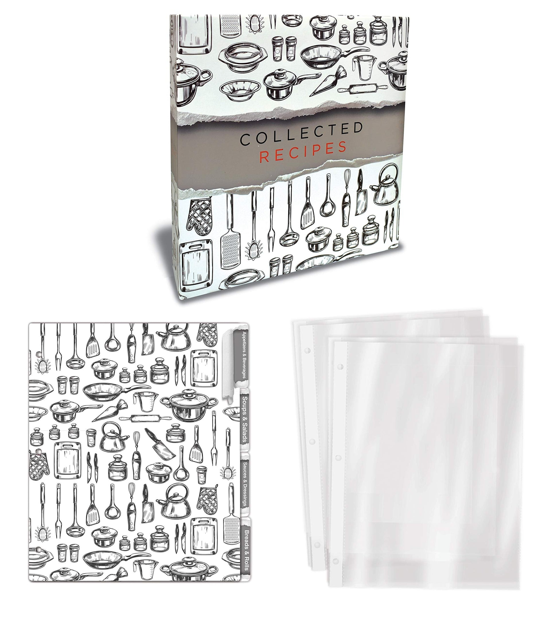 • COMPLETE SET - Comes with an 11.5 x 12' 3-ring binder, 50 clear letter sized protector sheets, and 12 divider pages featuring printed tabs of the most popular recipe categories.