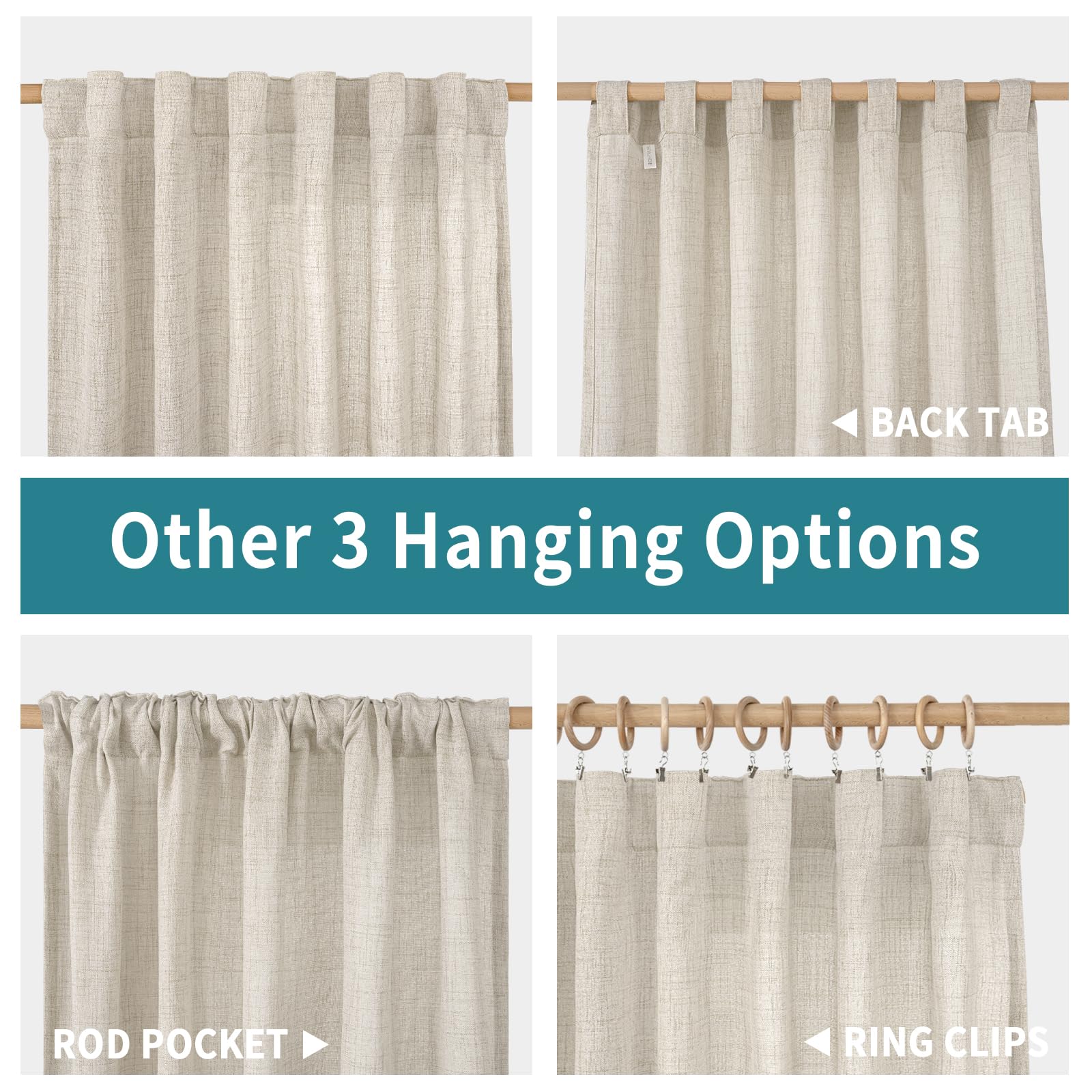 • PACKAGE INCLUDES: Set of 2 faux linen curtains. Each panel measures 52 Inch wide by 63 Inch long, with 7 back tabs and 3' rod pocket fits most standard rods and makes the maximize coverage of windows.