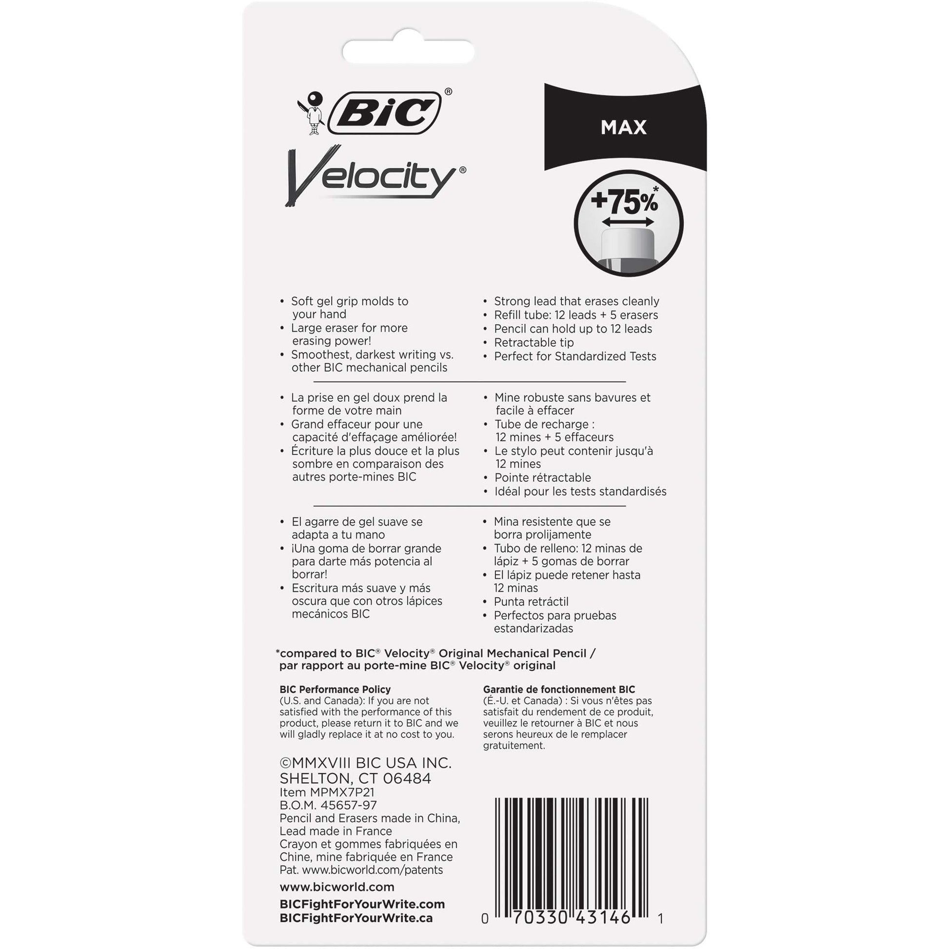 Details: Experience smooth, dark writing with BIC Velocity Max Mechanical Pencils with Extra Large Erasers. These 0.7mm mechanical pencils have a versatile medium point that’s ideal for a variety of writing activities. The lead doesn’t smudge and erases cleanly, so your work looks neat and professional. Convenient and reliable, BIC Velocity Max Number 2 Mechanical Pencils are always ready and never need sharpening; to advance the pencil lead, simply click the built-in eraser. These BIC pencils have a sophisticated, modern look, and their clips easily attach to pockets, notebooks and more. The No. 1 selling mechanical pencil brand in the United States*, BIC offers dependable performance and value that you can trust. Looking for larger quantities of school or office supplies? Choose BIC Mechanical Pencils With Erasers for a high-quality, safe and affordable product you can trust. *Source: The NPD Group/Retail Tracking Service and Commercial Tracking Service, U.S., based on actual unit sales, 12ME June 2022 combined.