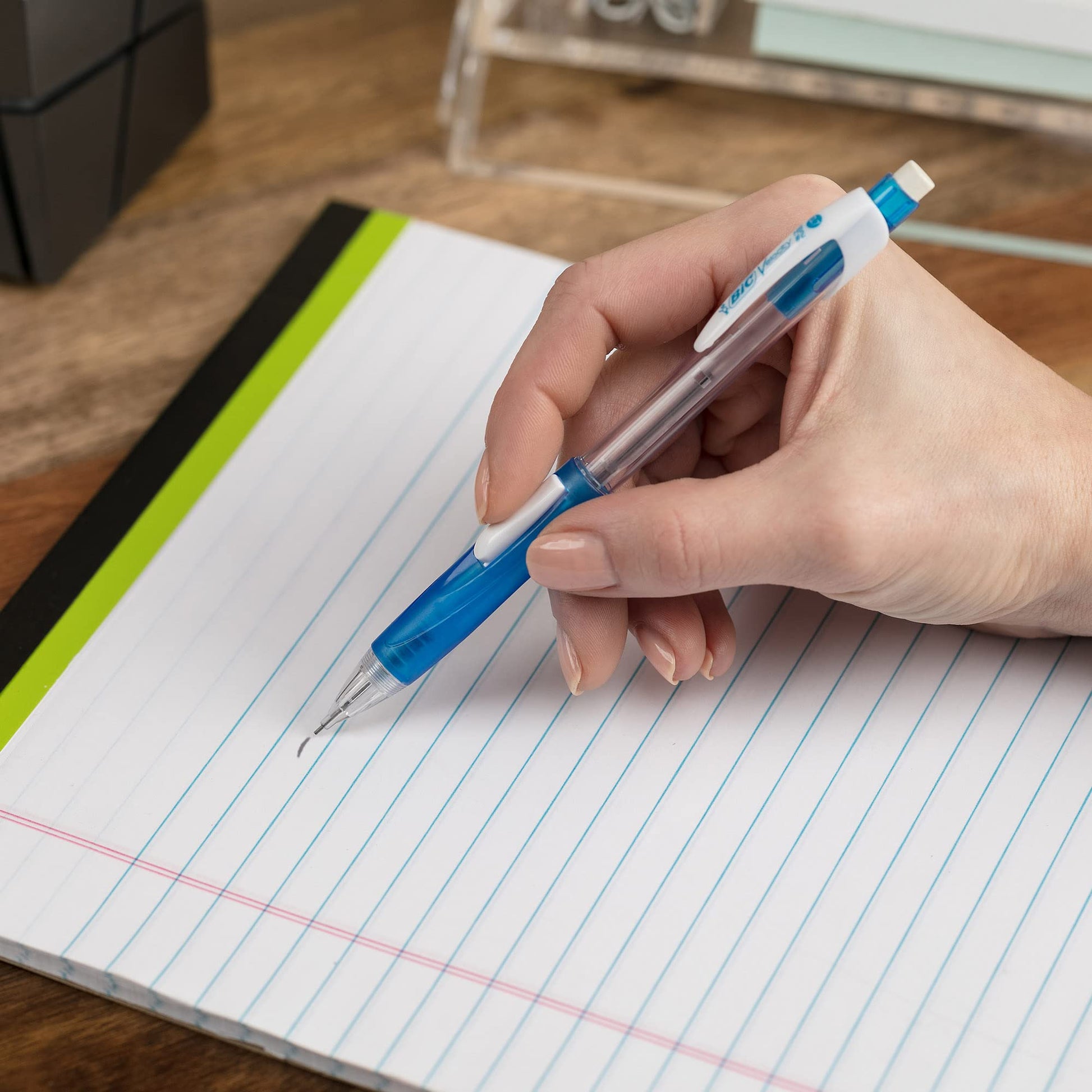 BIC mechanical pencils are always ready and never need sharpening; to advance the lead, simply click the built-in eraser