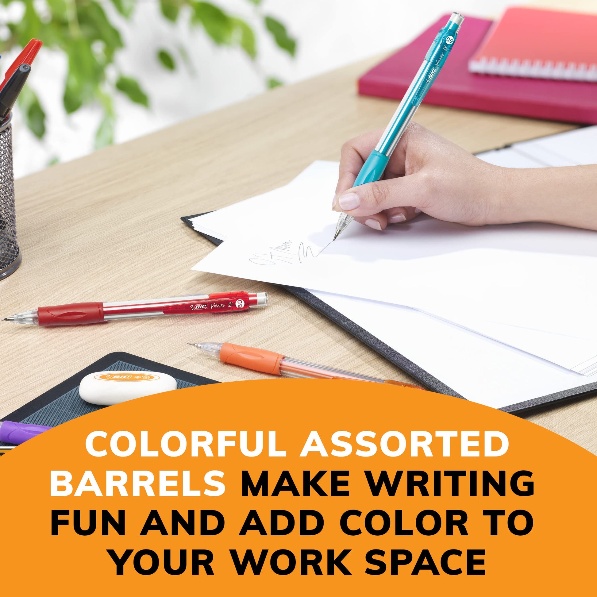 Details: Experience smooth, dark writing with BIC Velocity Strong Lead Mechanical Pencils with Erasers. These 0.9mm mechanical pencils have a thick point that’s ideal for a variety of everyday writing activities. They’re excellent mechanical pencils for school and come equipped with a refill tube of 12 pieces of No. 2 lead and five erasers that are compatible with most standardized tests. The strong lead doesn’t smudge and erases cleanly, so your work looks neat and professional. Convenient and reliable, BIC Velocity Number 2 Mechanical Pencils 0.9 mm are always ready and never need sharpening; to advance the pencil lead, simply click the built-in eraser. These BIC pencils have a sophisticated, modern look, and their colorful clips easily attach to pockets, notebooks and more.