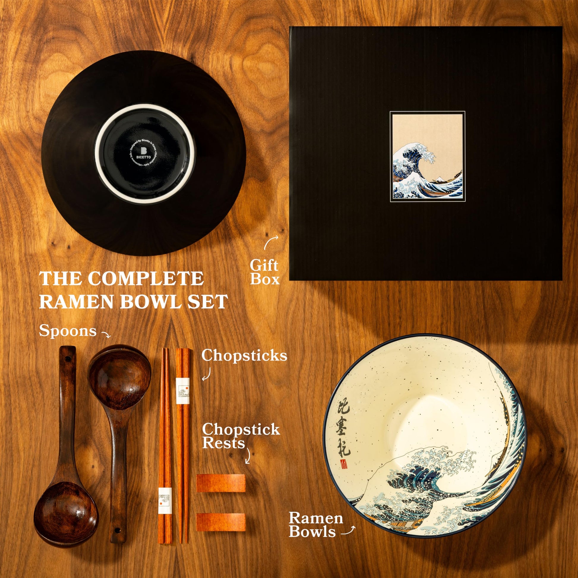 BICETTO Japanese Ramen Bowl Set with Great Wave Design - 60oz Large Ceramic Bowls, Spoons, Chopsticks for Ramen, Pho, Salad, Poke - Premium Gift for Ramen Lovers - Microwave & Dishwasher Safe