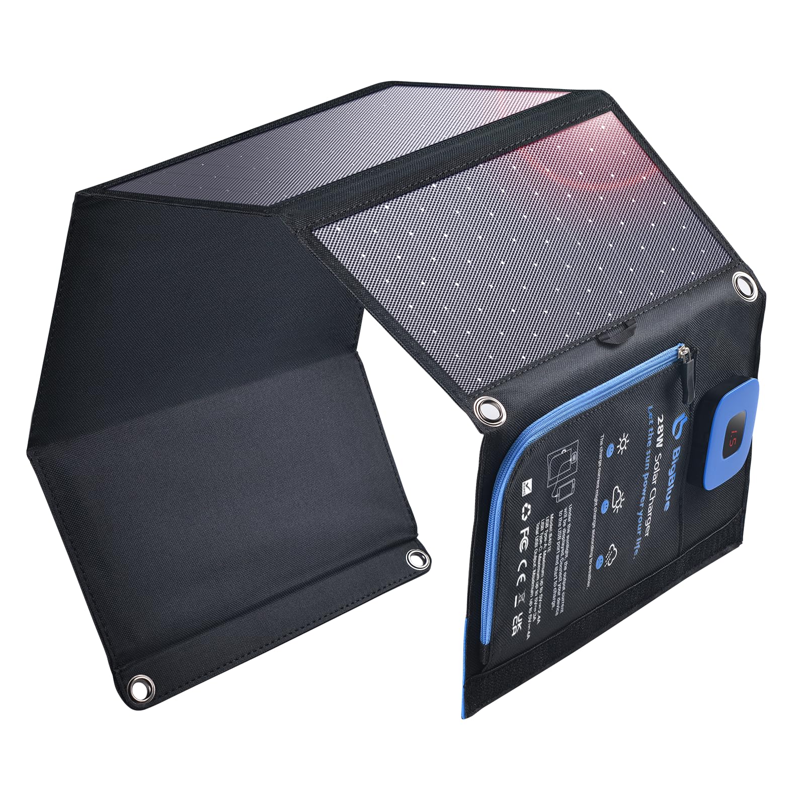 BigBlue Portable Solar Charger 28W with Digital Ammeter,25.4% High-Efficiency, USB-A/USB-C Ports, Folding Waterproof Solar Panels with Carabiners for Camping, Backpacking, Phones, Tablets, Power Bank
