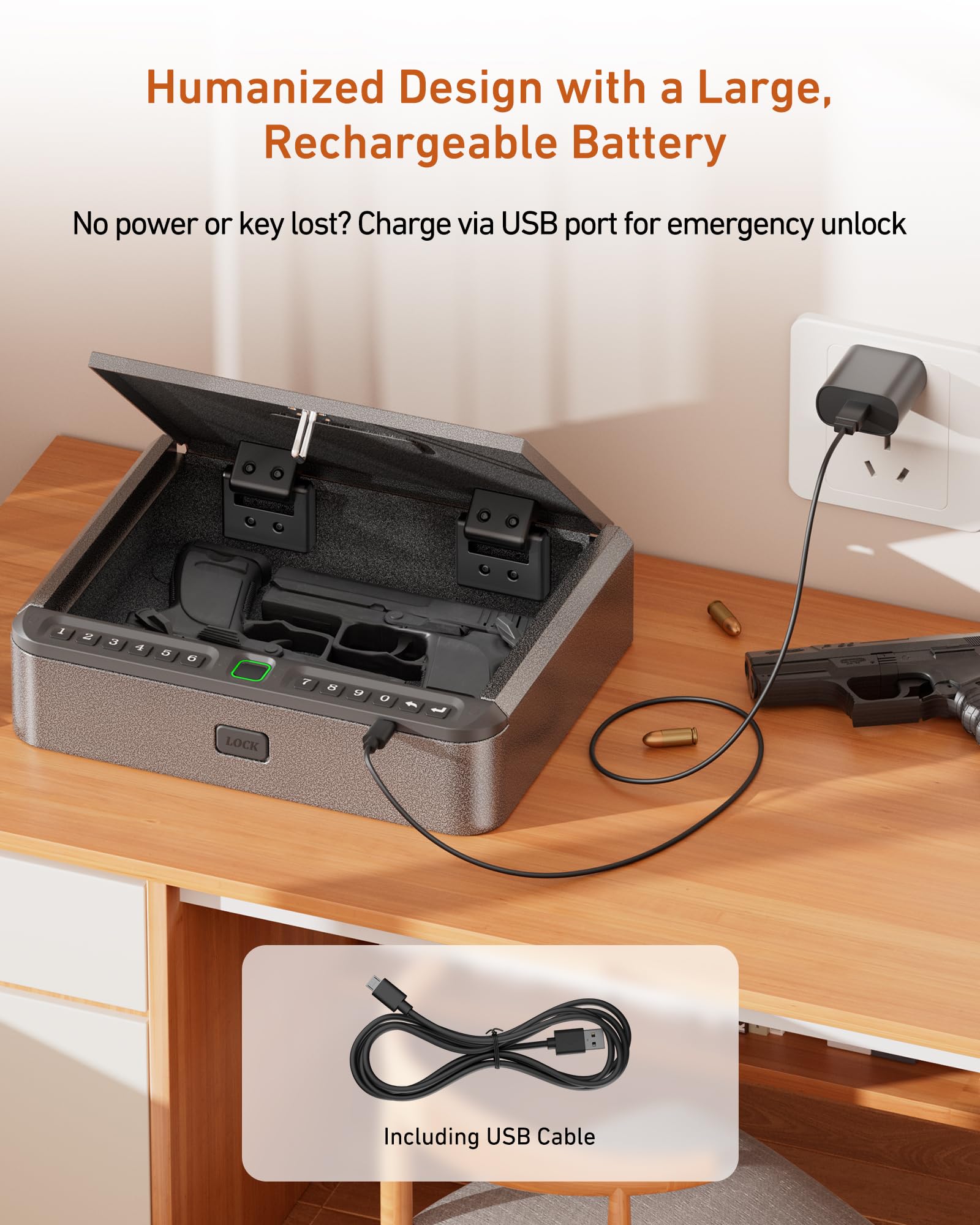 • USB Charging & Mute: The handgun safe has a 1800mAh large-capacity battery and a low-power consumption chip. It has an external USB charging port, which can be charged anytime, and has a low battery reminder function, so you don’t have to worry about battery power! Fingerprint safe also has a silent function and a user-friendly design, and you can also switch to silent mode according to your preference. A pistol safe with LED lighting makes picking up and placing items in the dark easier