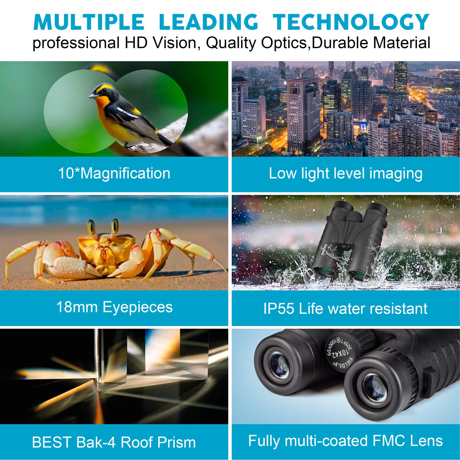 • Professional 10 x 42 HD Binoculars with Wide Field of View - Offering 10 x magnification with 42 mm objective lens, wide field of view and 1000-yard range, let you look further and wider with HD claritysuitable for both indoor and outdoor activities like bird and scenery watching, hunting, travel, sports, and concerts.