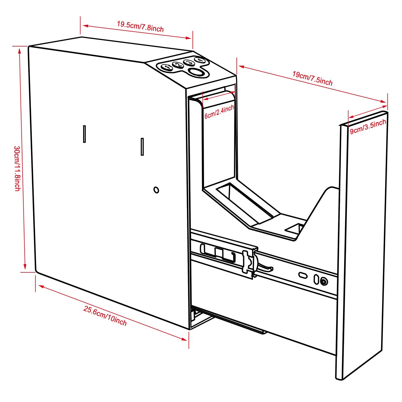 • Fits a handgun up to 9.5' length ( almost all on the market). and 1 spare magazine. Allows for multiple mounting configuration from TOP, RIGHT, LEFT side or sit directly on the floor. Stores great under a desk or nightstand, discreetly on a bookshelf, on the wall, or inconspicuously in a vehicle.