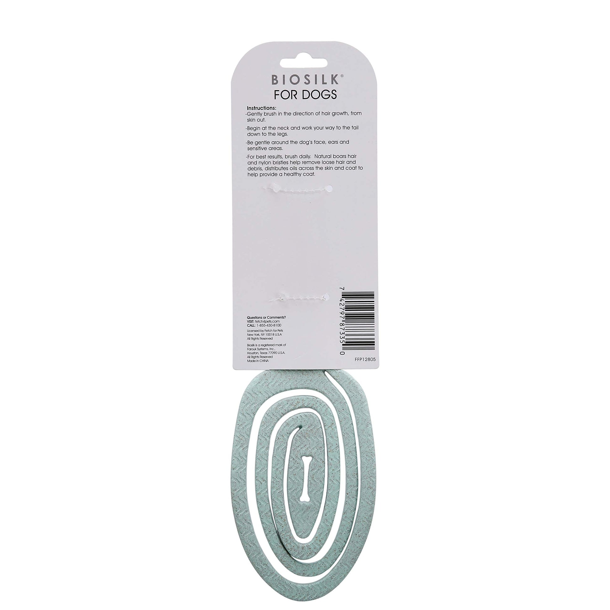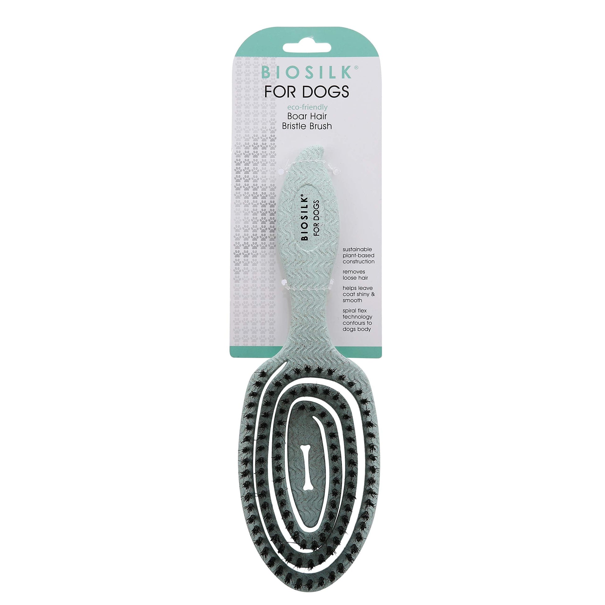 Details: BioSilk for Dogs is an innovative way to bring the same quality and luxurious experience provided to humans to their pets. This line features easy to use pet grooming tools and dog hair brushes that will remove loose hair while keeping your dog's coat shiny and smooth. BioSilk For Dogs Eco-Friendly Boar Hair Bristle Brush is a sustainable solution to maintaining your pet's natural beauty. Made from plant-based materials, this brush for dogs shedding supports both the planet and your dog's overall wellbeing. The brush's handle is ergonomically designed for an easy grip, making it comfortable for you to use on a daily basis. his dog hair brush has a wide handle grip, making brushing an enjoyable experience for both the pet owner and the dog. This is a great dog brush for shedding. Long hair & short hair dogs alike will benefit from this type of dog brush. The best way to reduce pet shedding is to regularly brush your dog, using high quality pet brushes for dogs' shedding. This soft bristle dog brush is gentle but effective at removing loose hair and debris on pets. The spiral flex technology of the boar hair bristles contour to your dog's body, leaving behind a beautiful sheen. The bristles are gentle yet effective at shedding your dog of loose hair. Finally, you and your dog can have a brushing experience you'll both enjoy. Directions: Gently brush in the direction of hair growth, from the skin out. Begin at the neck and work your way to the tail down to the legs. Though this is a soft dog brush, be gentle around the dog's face, eyes, and sensitive areas. For best results, use dog grooming brushes daily. Safety Warning: Brush gently so as not to irritate your dog's skin. Use care when brushing your dog's fur with a dog brush and dog grooming tools and dog stuff and puppy supplies. Also look into other dog tools for grooming like a slicker brush, undercoat rake for dogs, deshedding tool, furminator for dogs, and pet hair remover.