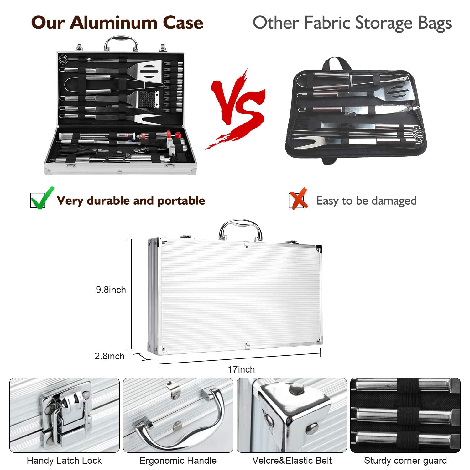 • 【Portable and Convenient Aluminum Case】Birald grill tools set comes with a delicate aluminum case for easy of storage and carry. The velcro locks each tool in a neat position, so you could easily keep all the barbecue tools neatly organized and get better protected in the portable aluminum case. The lightweight aluminum case is easy to carry which is ideal for camping or picnic.