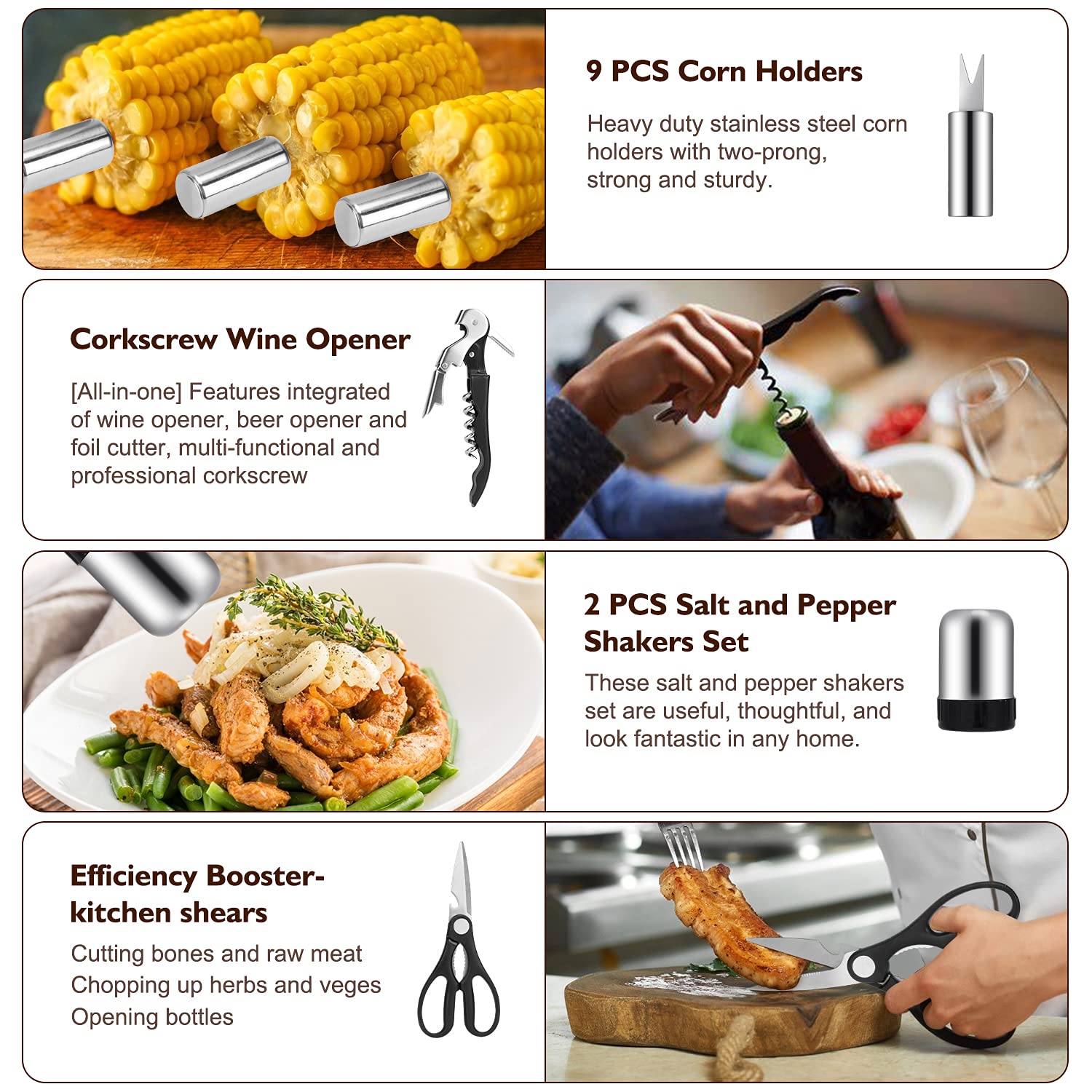• 【Complete Bbq Tool Set】Birald 34pcs convenient grill tools set comes with all the essentials you need for backyard barbecues and camping cookouts. It includes long-handled grill tongs, spatula, fork, meat knife; basting brush, grill cleaning brush, extra grill brush head , 2 grill mats, meat thermometer, meat injector, 2 pepper & salt shakers, 9 corn holders, 8 skewers, grill glove, kitchen shears, grill tongs, corkscrew, aluminum case.