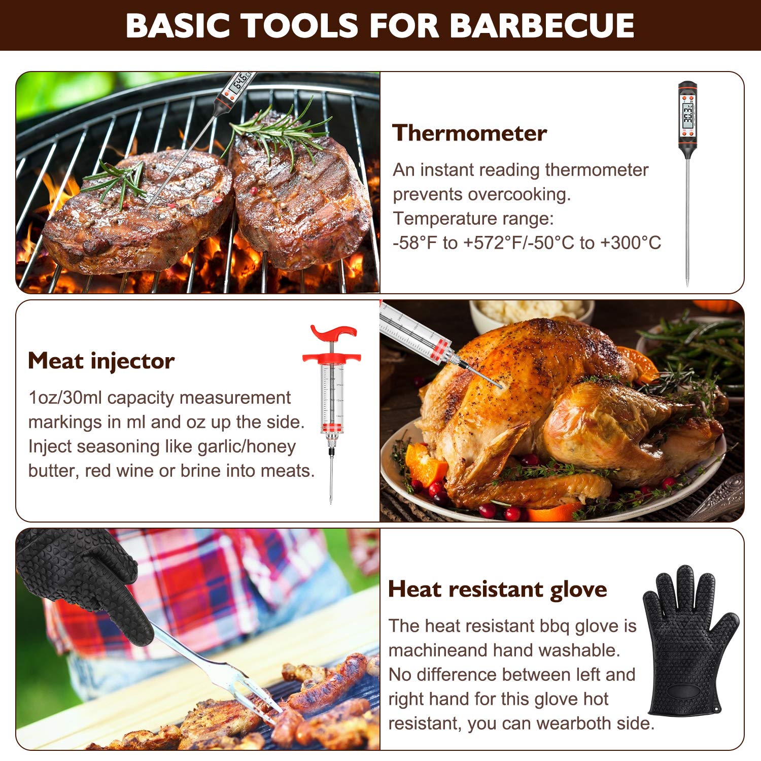 • 【Quality Grilling Accessories】The grilling accessories are made from professional grade stainless steel, more durable and safe than other bbq utensils as they will not crack or melt after extended use. Coming with perfect heft, each essential of the barbecue tools kit can behave well in your grilling and they will not rust over time, remaining brand new as you first bought them after years of use.