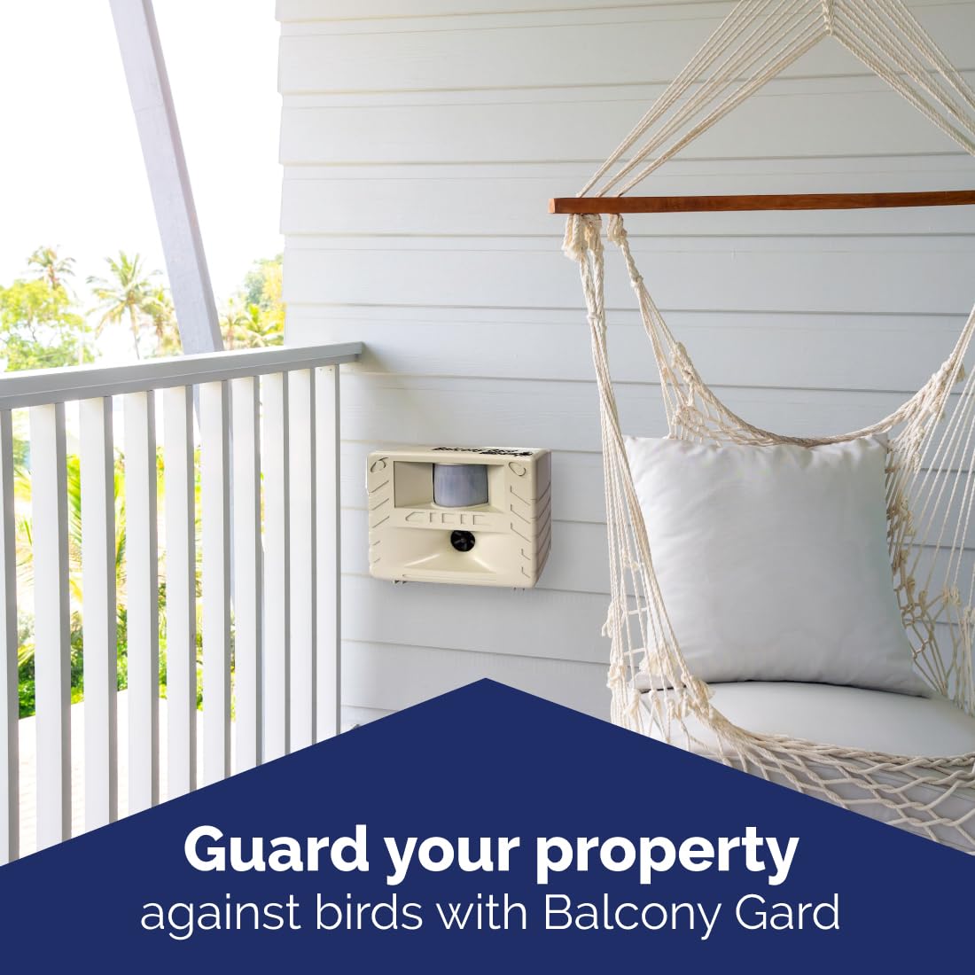 Unleash the power of the Bird-X Balcony Gard Ultrasonic Bird Device, your ultimate solution for effective and humane bird control in residential spaces. With ultrasonic sound waves that are silent to most humans, this innovative device eliminates damage caused by unwanted avian visitors. Operating silently within the range of 15 to 25 kHz and with a sound pressure of 90 dB at 1 meter, this bird decoy device effectively keeps away pigeons, crows, blackbirds, sparrows, starlings, swallows, grackles, ducks, seagulls, gulls, rodents, bats, and more while remaining suitable for children, pets, and the environment. With adjustable frequency settings, our bird decoy covers up to 900 square feet, offering customizable protection for balconies, porches, carports, patios, yards, garages, small pool areas, greenhouses, enclosed gardens, and more. This Balcony Gard is perfect for maintaining a bird-free space without using chemicals, traps, or any other inhumane methods. The device operates through both continuous and motion-activated modes, ensuring tailored defense without disturbing your surroundings. Our ultrasonic bird preventer can be operated with the included power cord or batteries. Its easy installation, weather-resistant construction, and user-friendly operation make it a hassle-free choice for maintaining a quieter, cleaner, and bird-free outdoor environment.