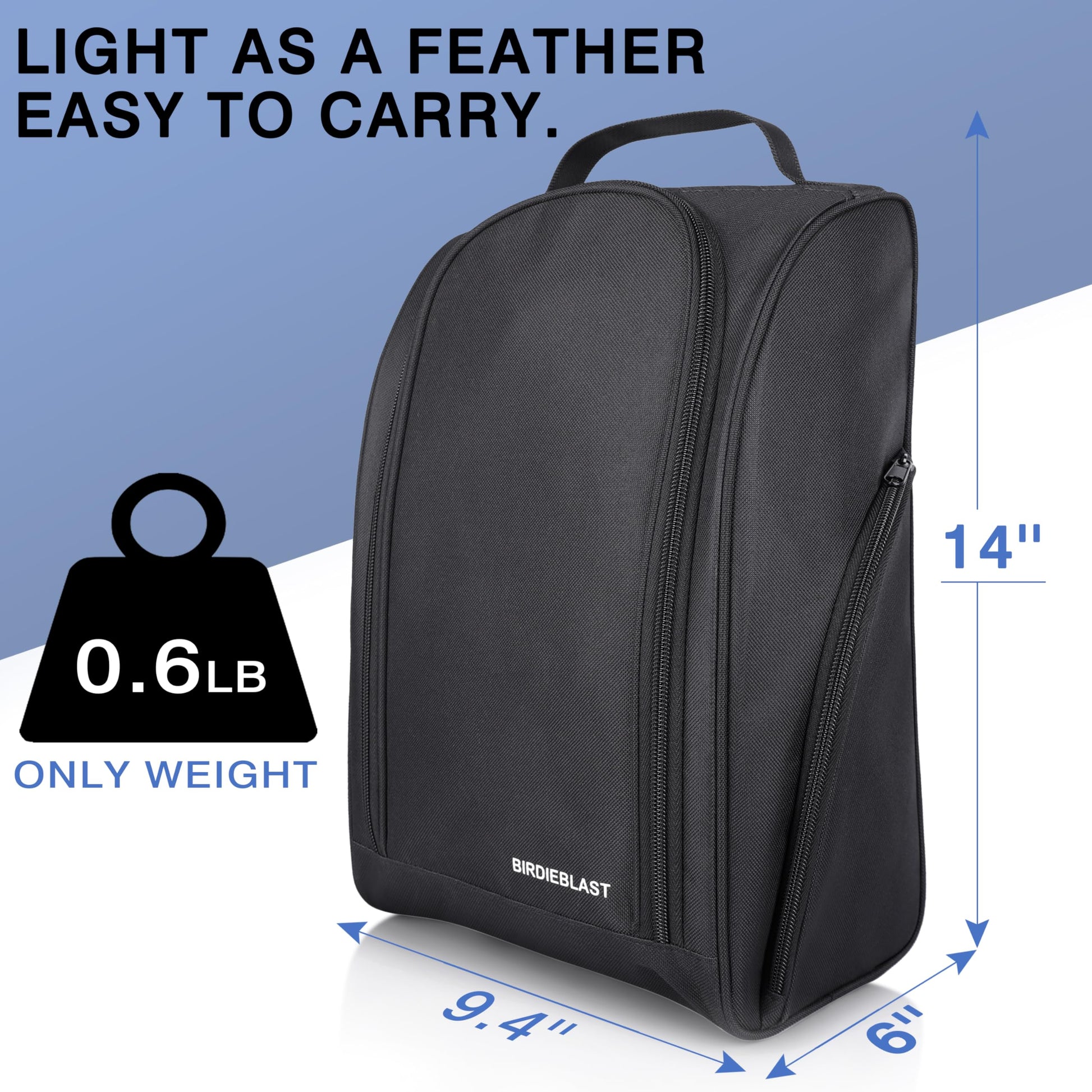 • SHOE BAG DIMENSIONS: 9.4 inches (L) * 6 inches (W) * 14 inches (H), suitable for up to size 14 (US Men's)/15 (US Women's) shoes. Designed for golf shoes but versatile for any type of athletic footwear - baseball cleats, basketball sneakers, soccer cleats - or for transporting and traveling with your work shoes - dress shoes, high heels, etc.