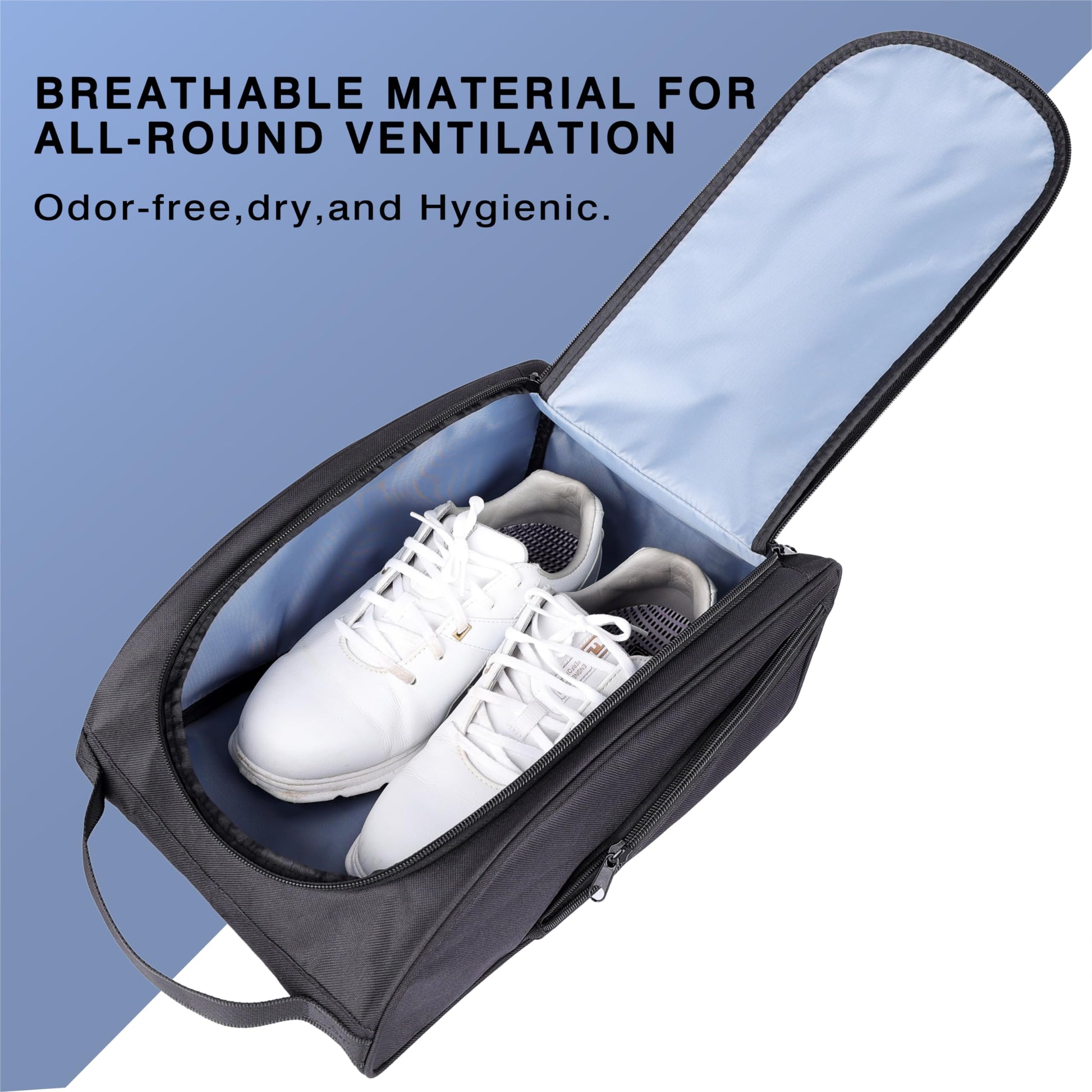 • PERFECT GOLF SHOE BAG: The large horseshoe-shaped opening design facilitates the storage and retrieval of shoes, while convenient side pockets can be used to store tees, golf balls, socks, and other accessories.