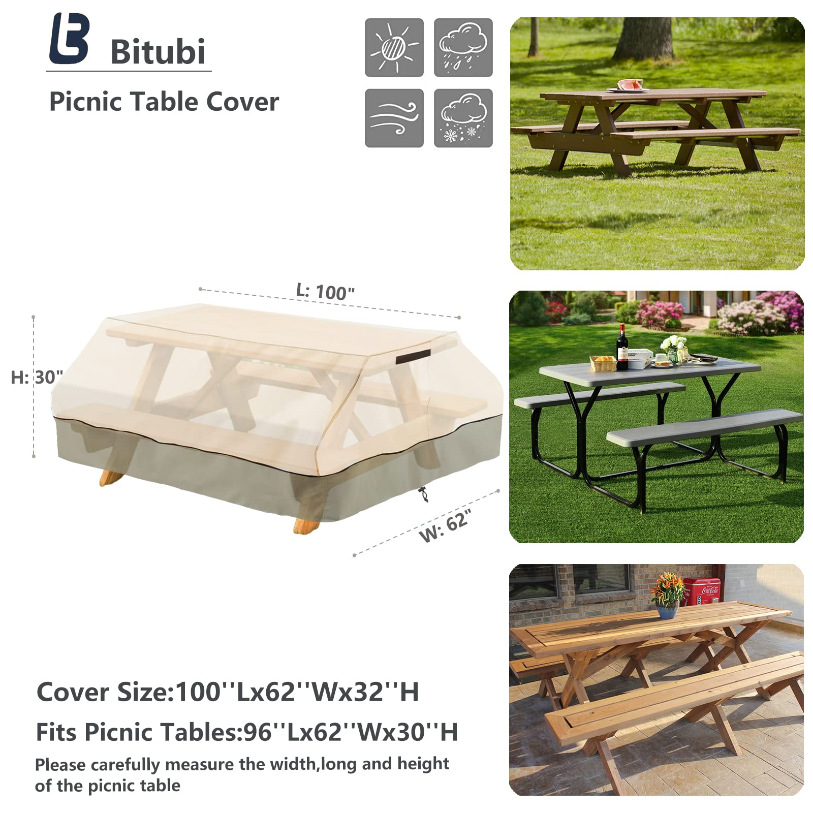 • 【Decent Size】: Fits 96 Inch picnic tables size up to 100”L x 62”W x 30”H. Please measure carefully before purchasing.