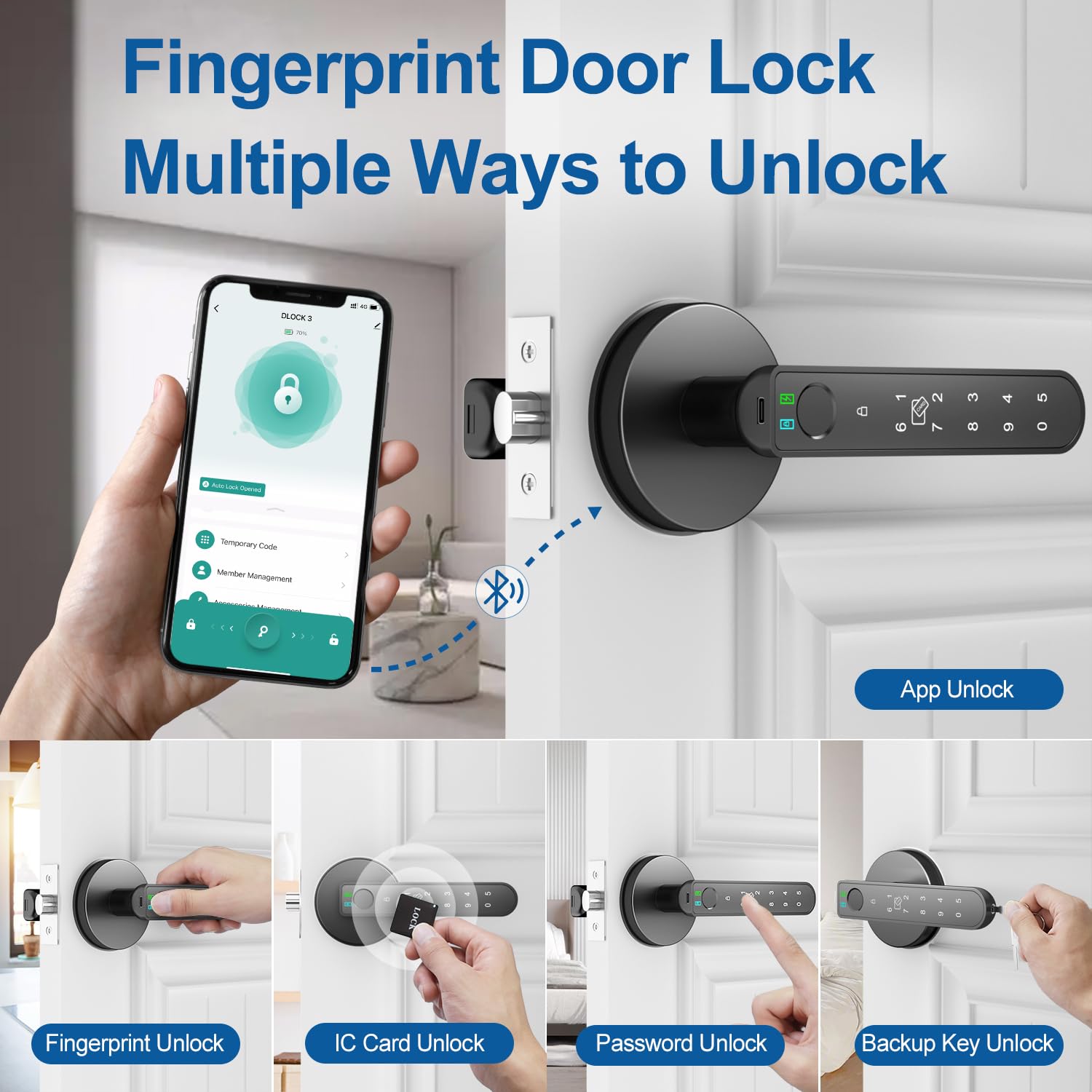 BIWIBON Smart Door Knob - 5 in 1 with Smart APP, IC Cards, Password, Backup Keys - Fingerprint Door Knob with Keypad for Bedroom, Office, Apartment - Black, 3 Pack
