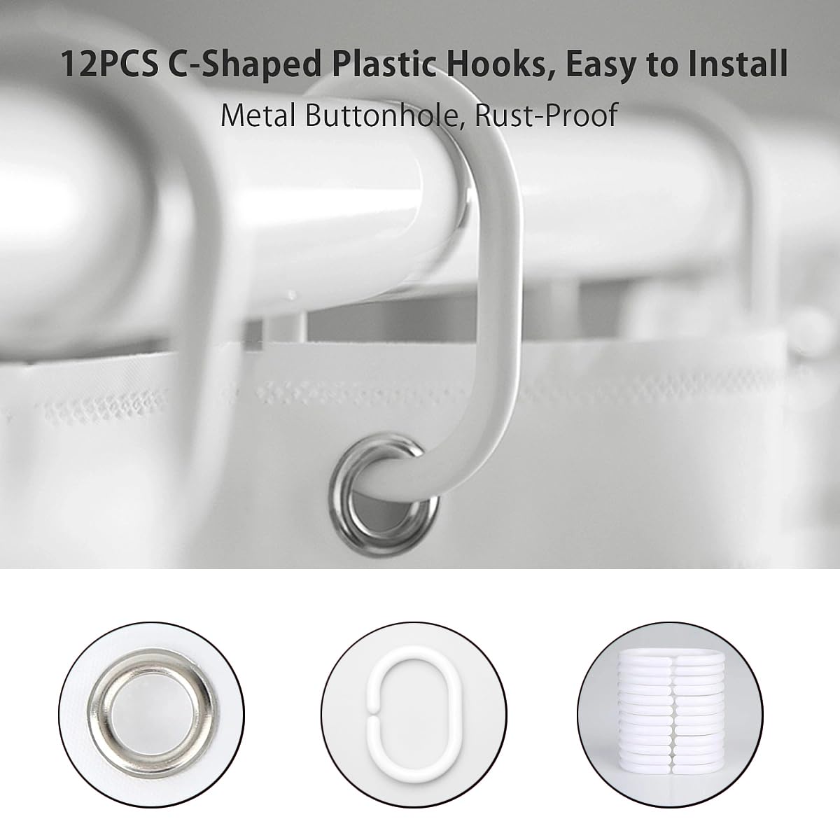 • PACKAGE INCLUDES:1 x Shower Curtain,12 x Plastic Hooks,No Extra Liner Needed,Machine Washable.