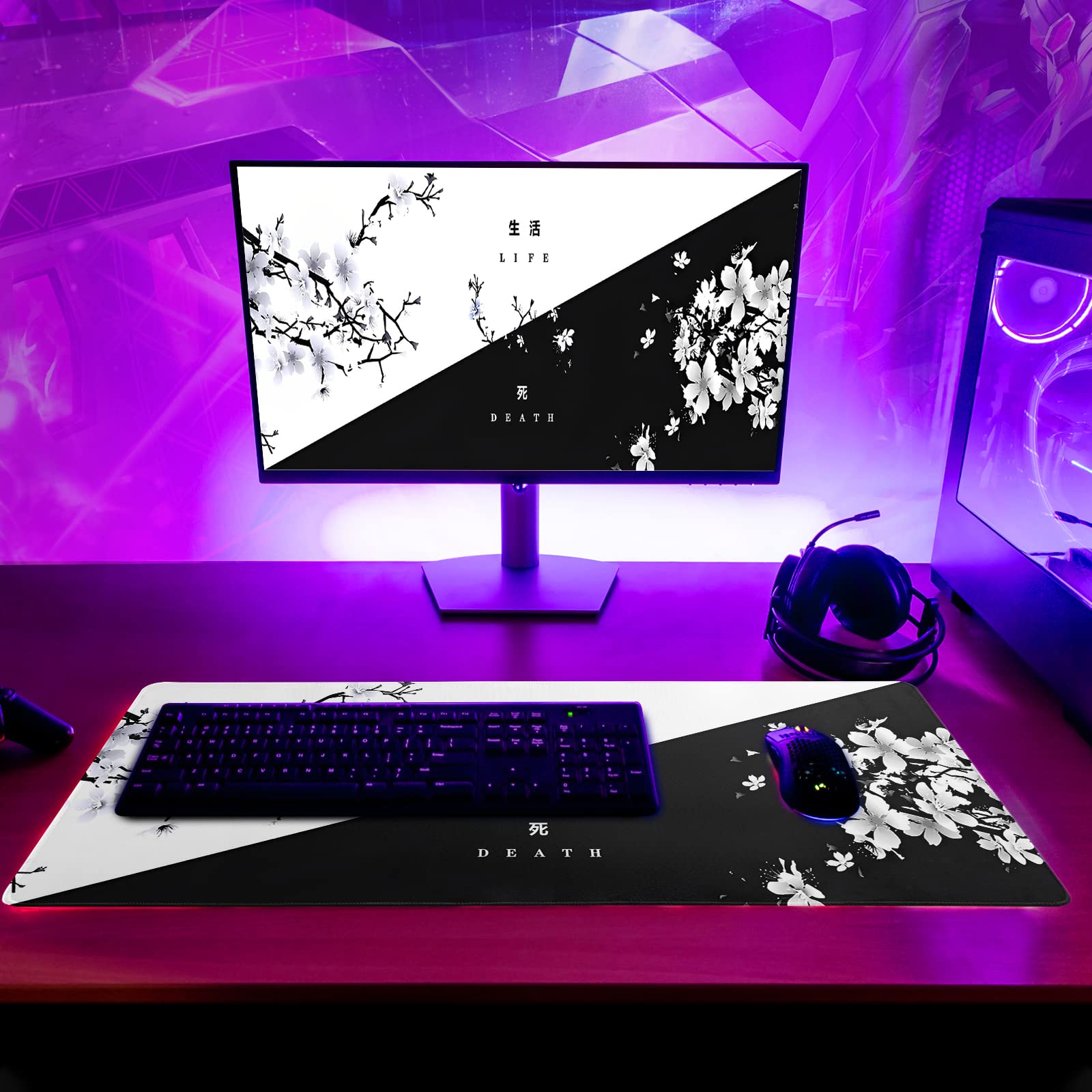 Black and White Japanese Cherry Blossom Gaming Mouse Pad Sakura Death Life Flower Mat 31.5x11.8 Inch Texture Non-Slip Rubber Base Mousepad Stitched Edges Keyboard Desk Pad for Office Home Game
