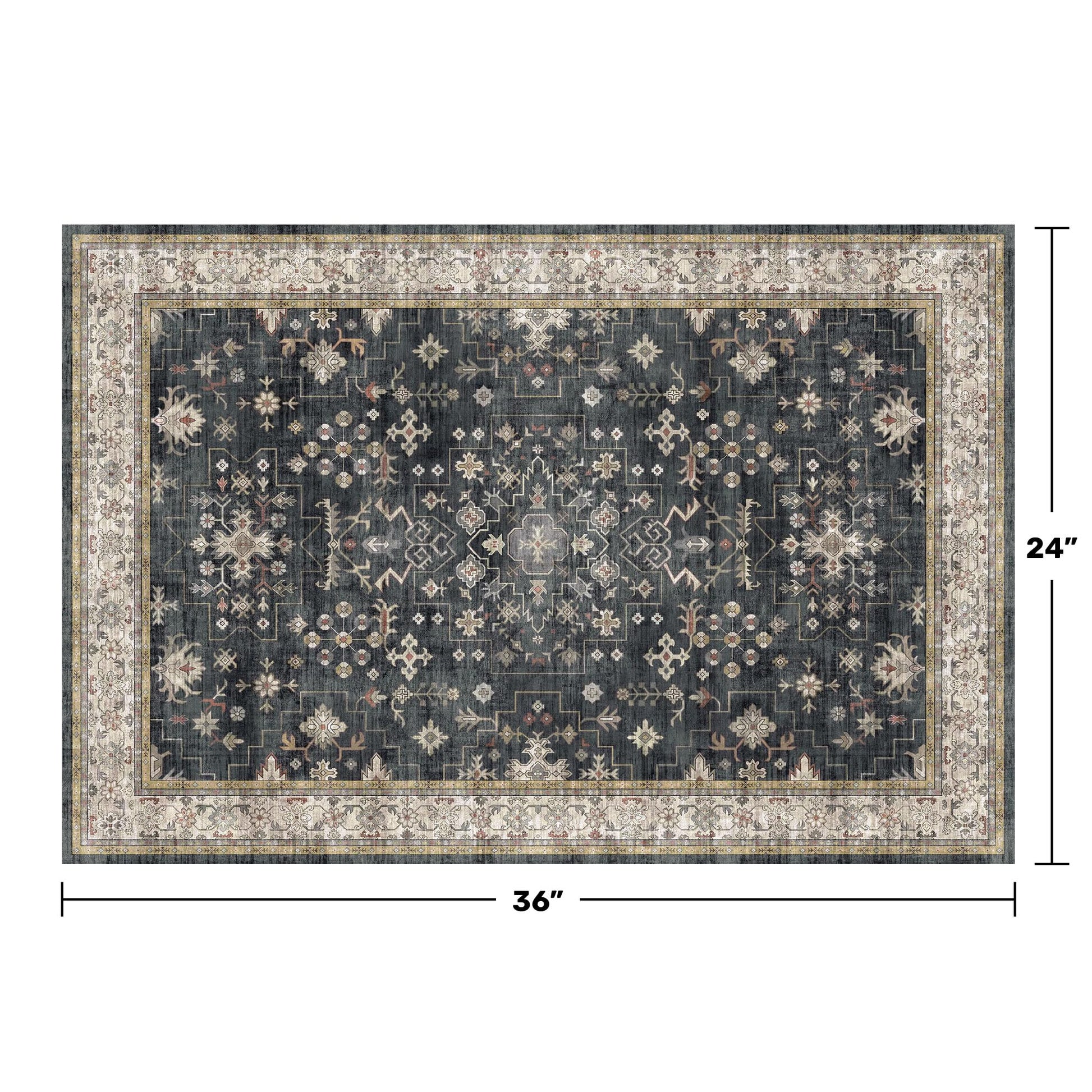 • Tribal Distressed Elegance: Featuring a gracefully faded charcoal base, it showcases dusky tones accented by soft hints of beige, red, yellow, and green for a look that blends elegance with rustic appeal.