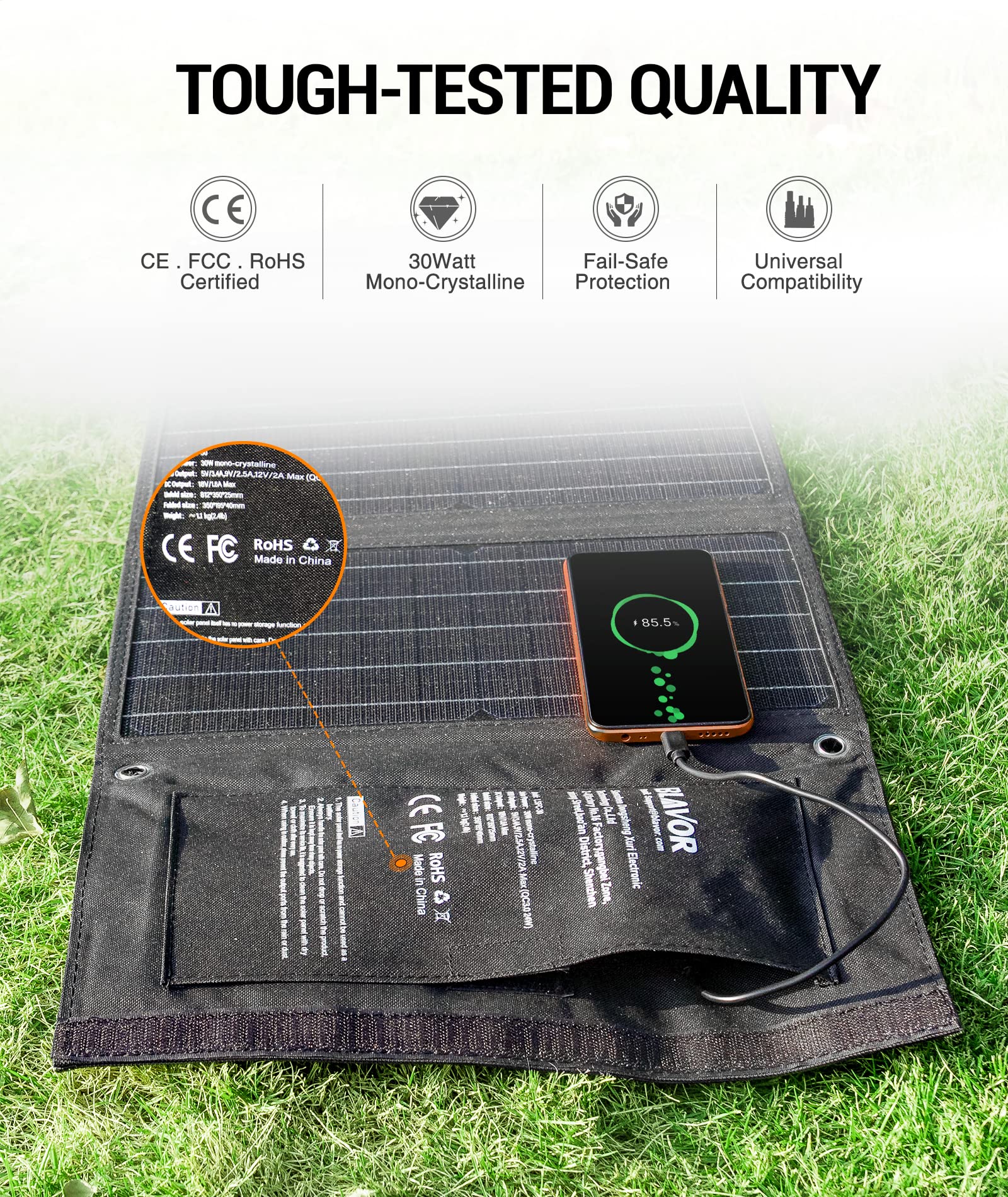 • Perfect Choice for Outdoors: 30W solar panel features a foldable and space-saving design for easy storing and carrying. Equipped with 4 metal hanging holes, you can easily hang it on your backpack or a tree to get solar energy while RV camping, on off-grid trips, hiking, climbing, etc.