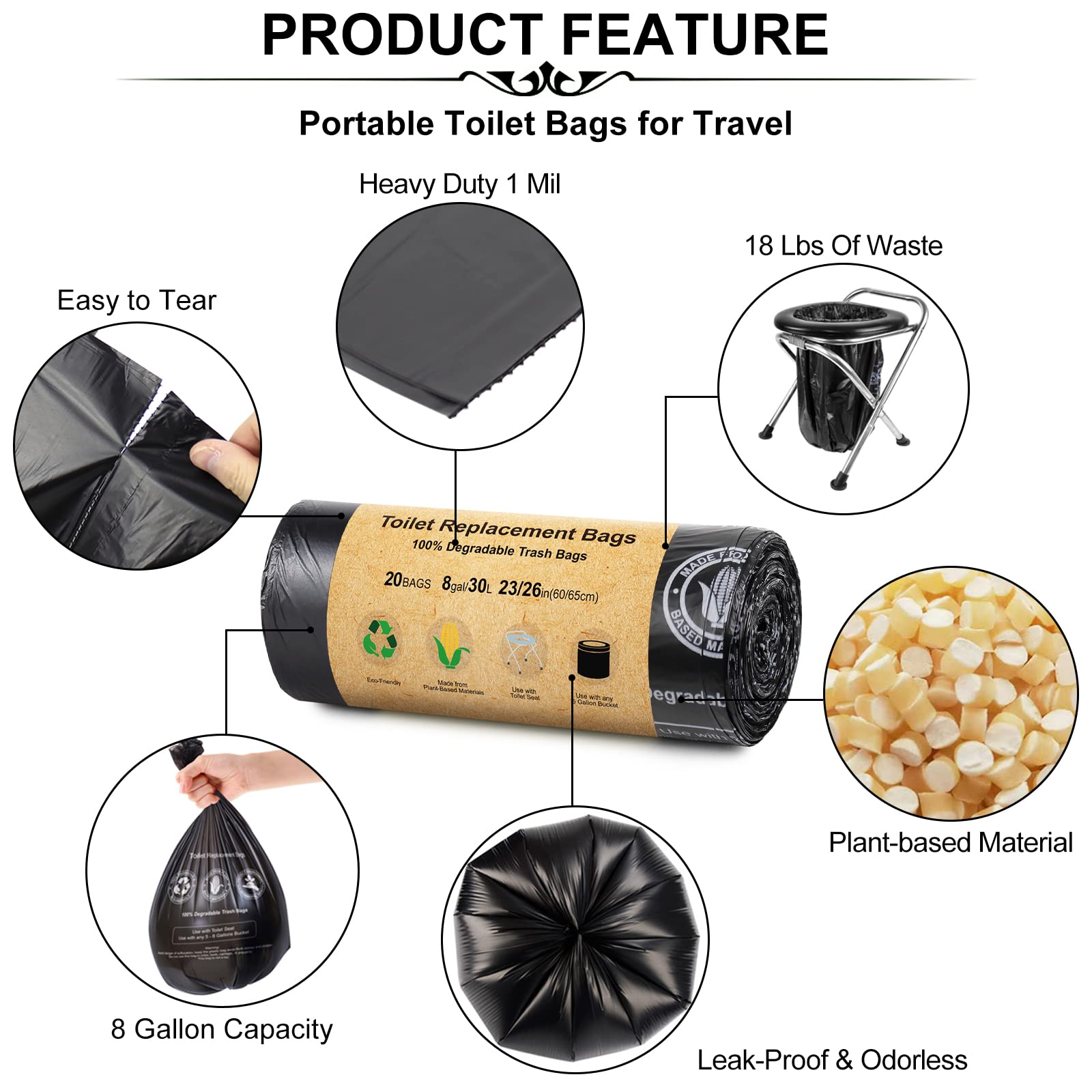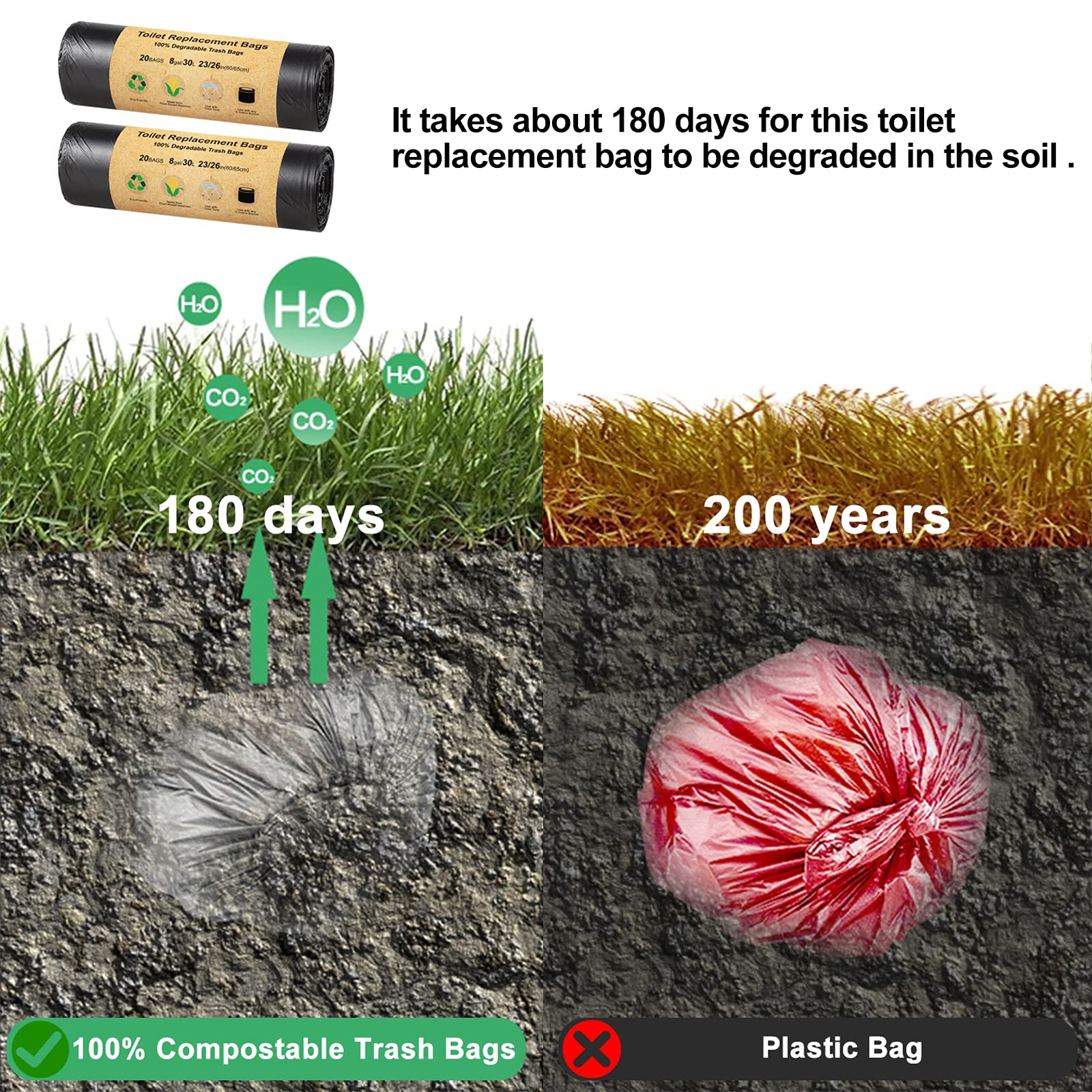 • EASY DISPOSAL: Made from plant starches and contain NO polyethylene, these compost trash bags are safe for the environment and break down quickly and easily. When you go camping & hiking, simply dig a hole, bury your compost bag, and It takes about 30-180 days for this toilet bag to be degraded in the soil.