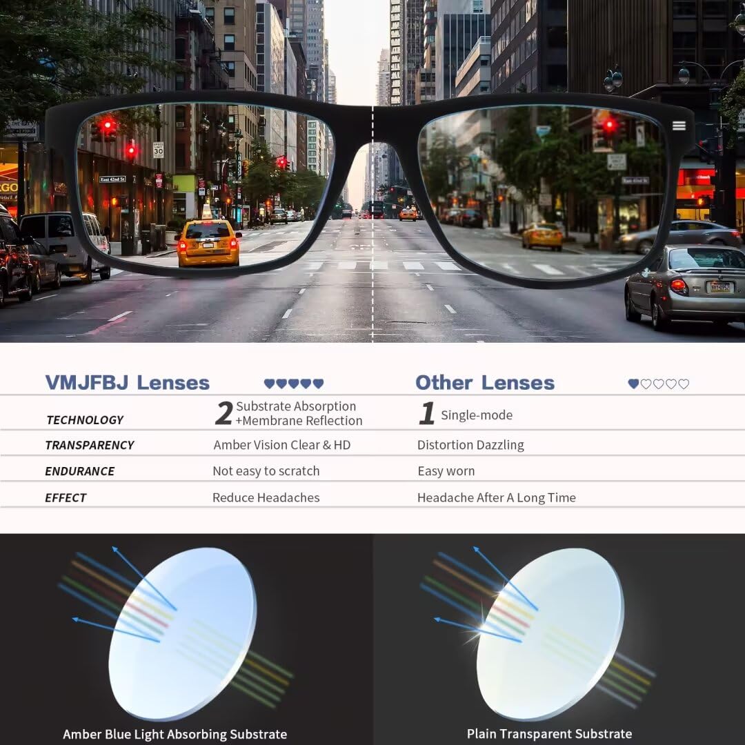 • BLUE LIGHT GLASSES AMBER LENS UPGRADE: VMJFBJ blue light glasses amber base lens upgrade technology, more eye protection!Substrate absorption+Membrane reflection dual protection blocks 99% harmful blue light from 385-445nm and receives beneficial blue light from 445-505nm, giving your eyes the highest level of protection! Say goodbye to blurred vision, eye strain, headache and migraines caused by long hours in front of computer, mobile phone, TV and other electronic screens.
