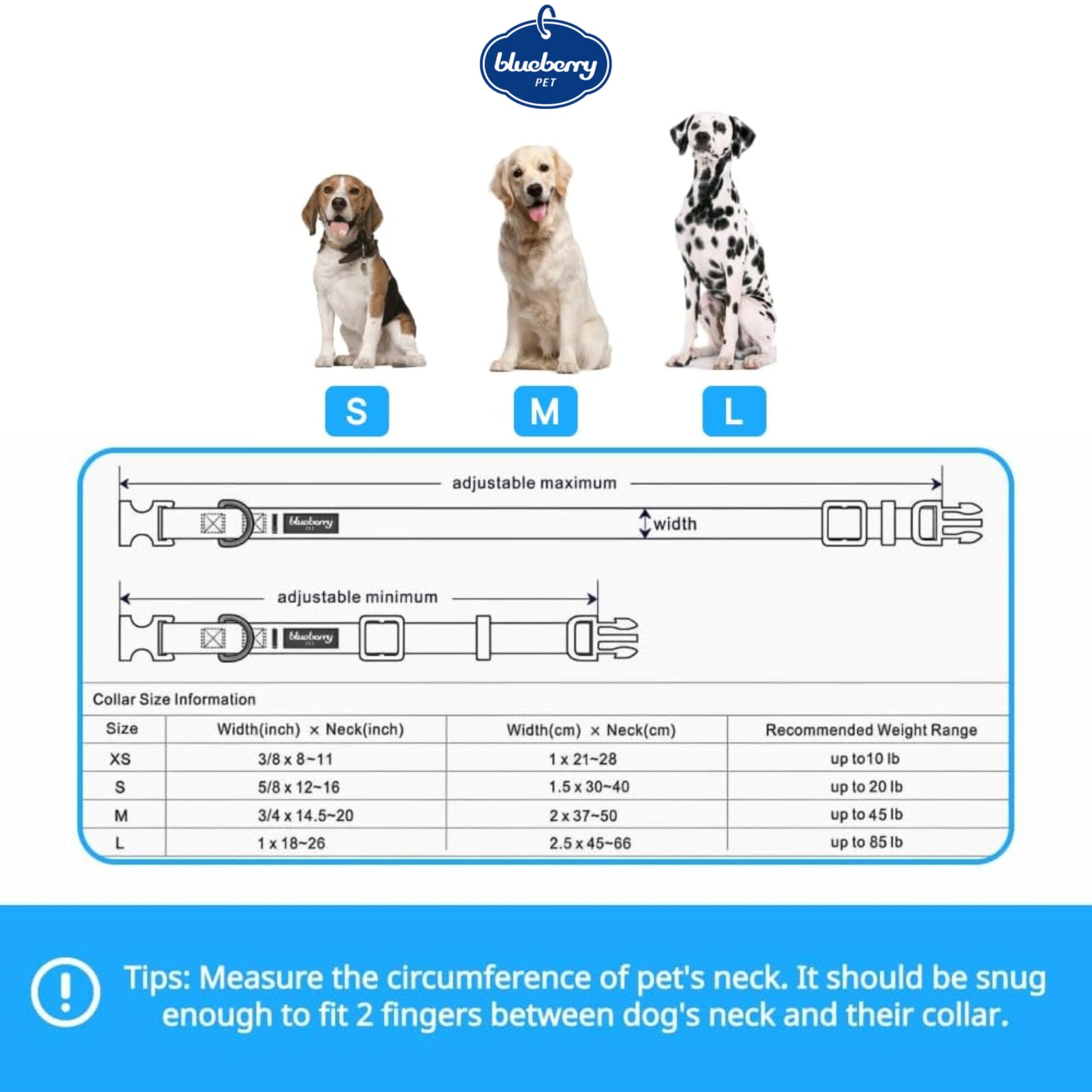 • All pictures are taken with our production samples from a size of Medium (Width 3/4', Neck 14.5-20'); Please measure your pets carefully to make a safe and fit purchase. Always look at the size chart for the recommended weight range to confirm the size