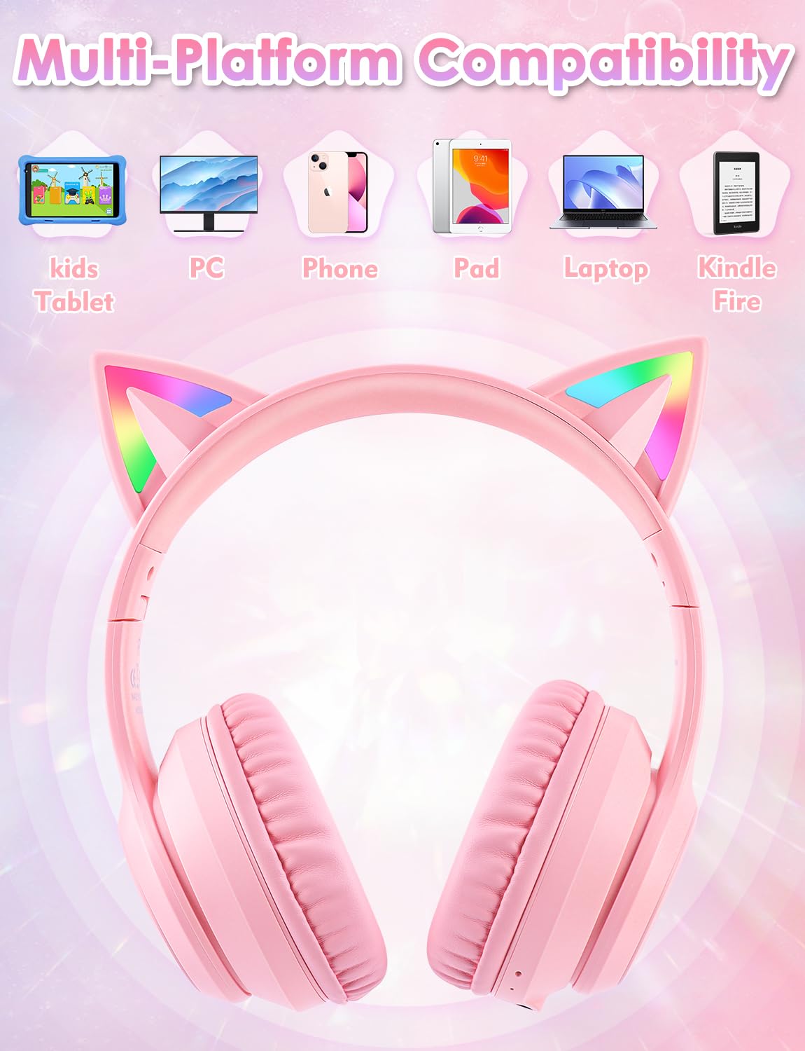 Bluetooth Kids Headphones with Microphone, Cat Ear LED Light Up and 85dB Volume Limited Toddlers Study Headphones, Wireless Foldable HI-FI sound Over-Ear School Headphones for iPhone/iPad/Laptop/PC