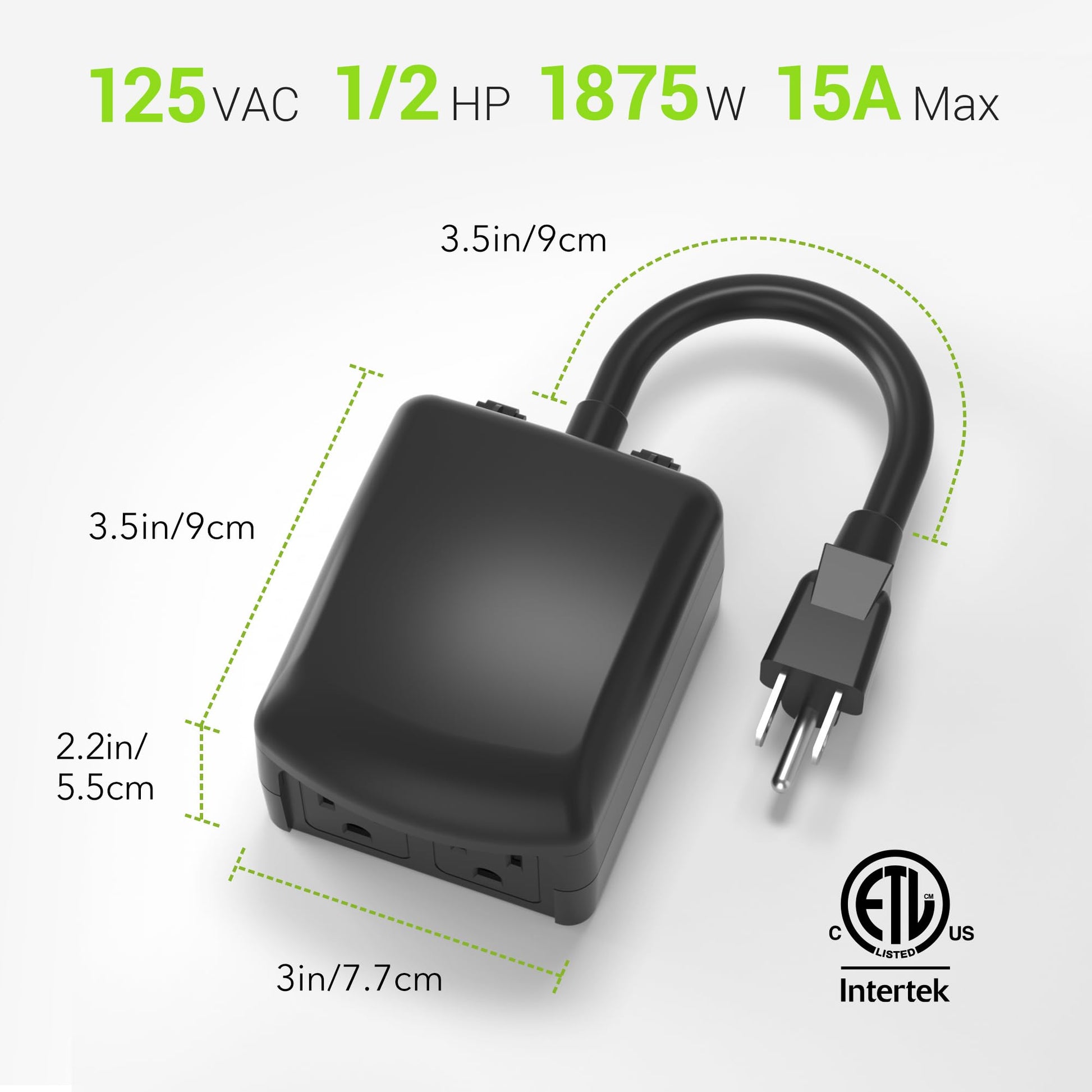 • Our outdoor dual 3-prong, grounded timer outlet is ETL listed, and conforms to UL Std. 917. Rate Voltage: 125V, 60Hz, 15A Max, 1875W Resistive or General Purpose, 8A Tungsten Lamp, 1/2HP, TV-5. Note: Compressors may affect the rating of your appliance when being used with our products. Please ensure the BTU/hr on your appliance is compatible with our product. Please refer to the application guide in the technical details.