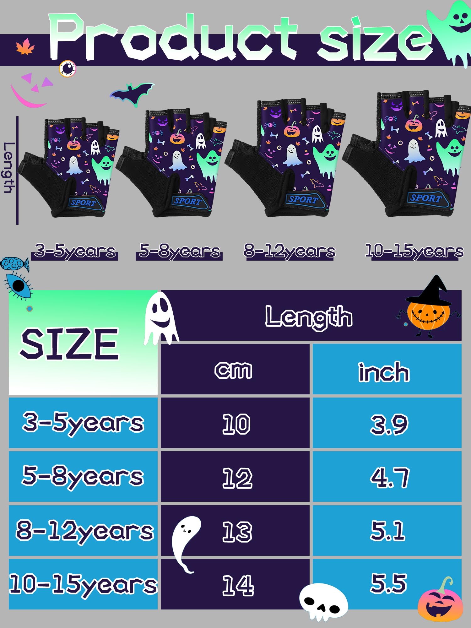 Boao 3 Pairs Kids Bike Gloves Kids Half Finger Fingerless Workout Gloves Non-Slip Gel for Bike Motorcycle(Halloween 1,3-5 Years)