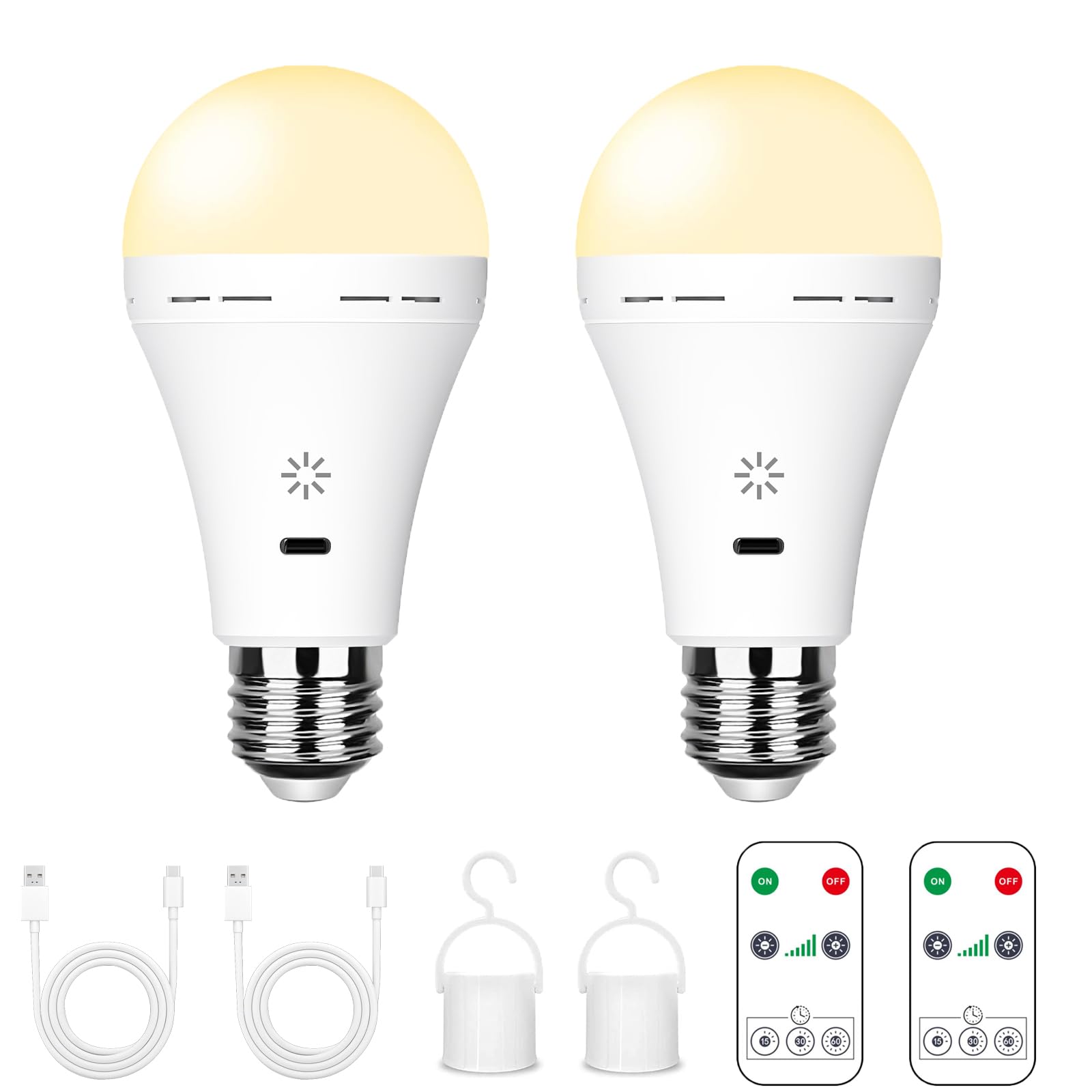 BOBOPAI USB Rechargeable Light Bulb with Remote Control, 2600mAh Battery Powered Light Bulbs E26 Touch Control Dimmable LED Bulb with Timer, Outdoor Emergency Bulb with Hook,3000K/2 Pack