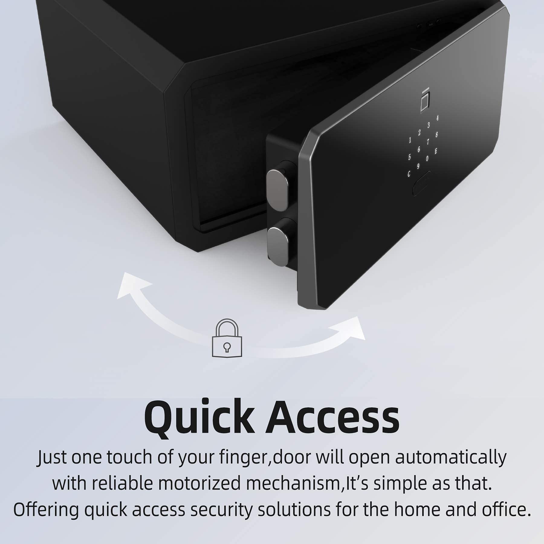 • 【Quick Access】The fingerprint safe just one touch of your finger, door will open automatically with reliable motorized mechanism, it’s simple as that. The home safe offering quick access security solutions for the home and office.