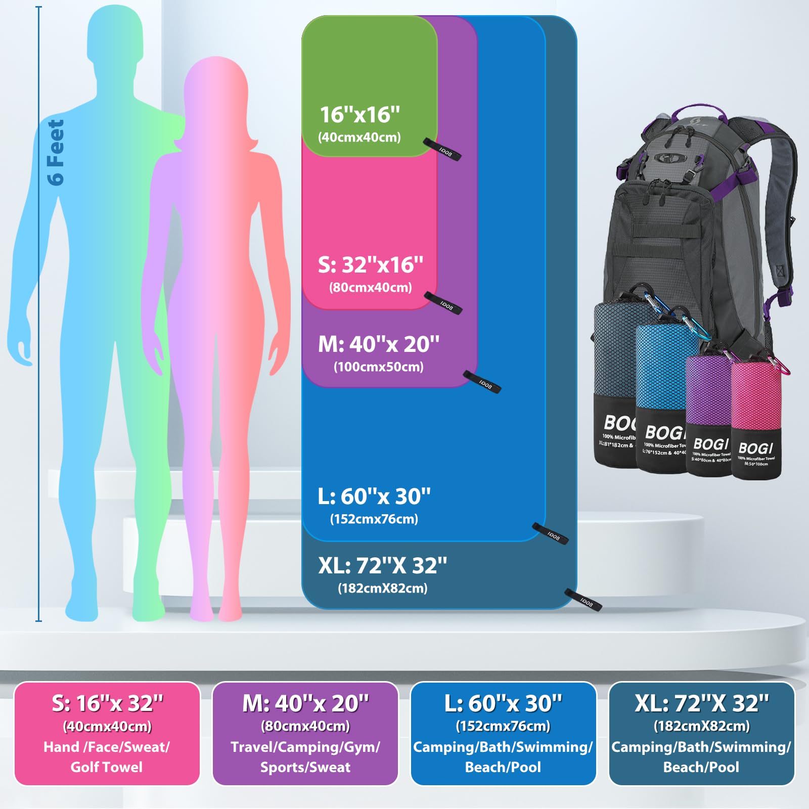 • 4 Sizes & Multi Use: BOGI microfiber towel set has 4 sizes in 6 colors. S: 16'x32' (2Pcs) is suitable for daily use, right size for your face, neck or hands to wipe the sweat off. M: 40'x20', best for backpacking, travel, camping, swimming, yoga, gym. L: 60'x30'+16'x16', good as a bath towel, microfiber towel for body or as a cape, blanket to keep warm, cover your deck chair. XL: 72'x32'+16'x16', an excellent pack towel for beach blanket, picnic mat, wall blanket or fashion as a tablecloth.