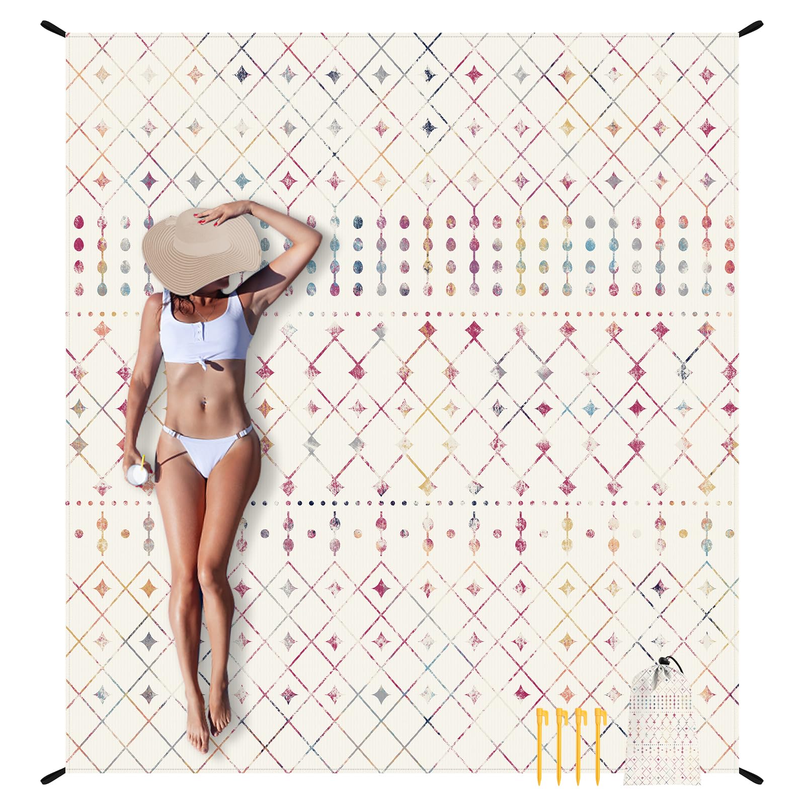 Boho Moroccan Beach Blanket Sandproof, Large 78"×86" Beach Mat Sand Free Waterproof Fits Up to 4 Adult, Compact Quick Dry Polyester Outdoor Picnic Blanket with Stakes for Travel, Camping, Hiking