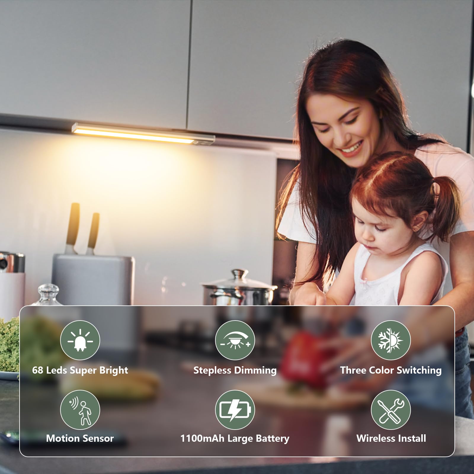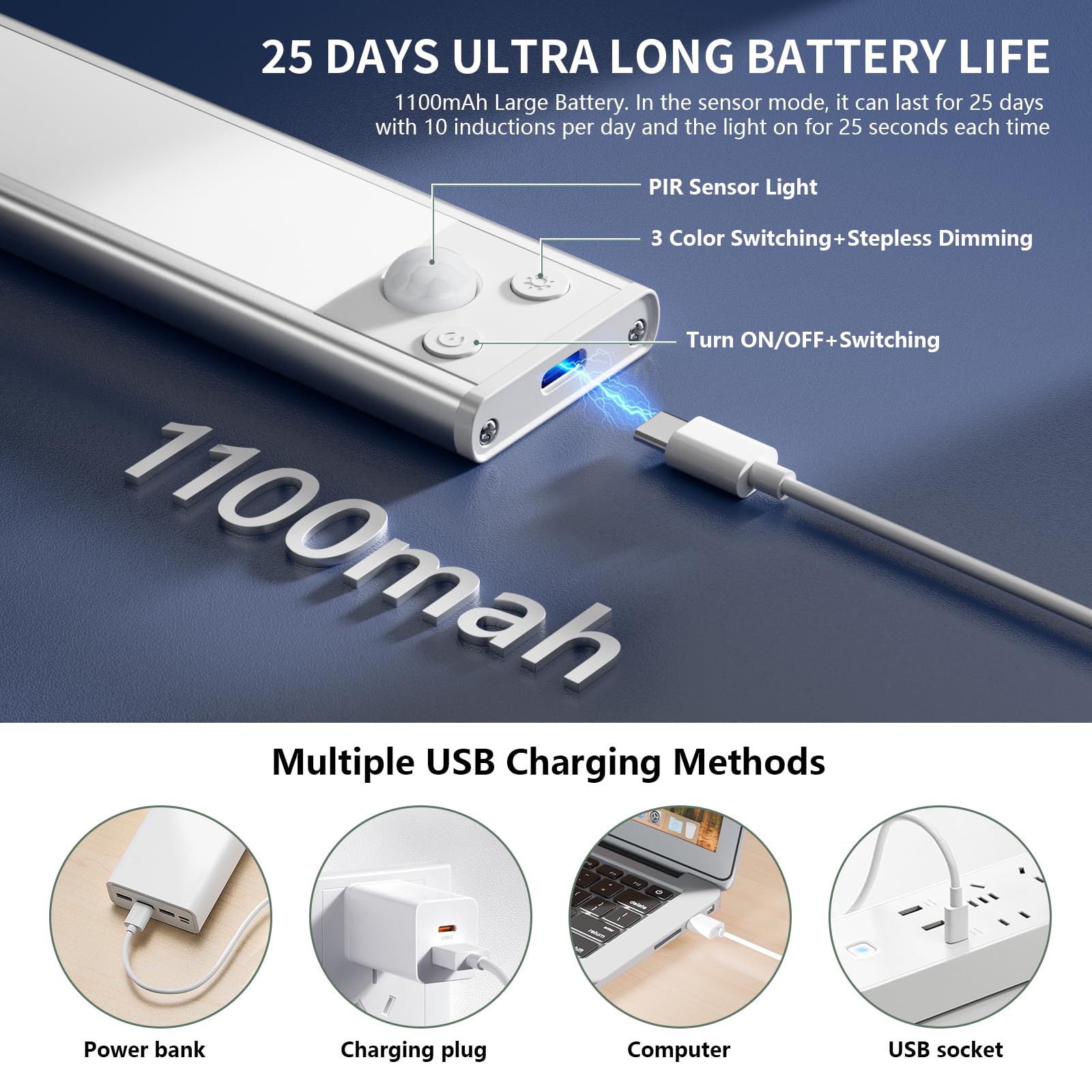 • [USB-C Rechargeable] After fully charged, these battery operated lights for kitchen last up to 4 hours in power mode and one month in motion sensor mode. No more AAA batteries. Energy-saving and environmentally friendly. When the energy is consumed, the configured USB-C charging cable can quickly charge the LED under-unit light, it can be easily removed and reused when the battery of the LED strip needs to be charged.