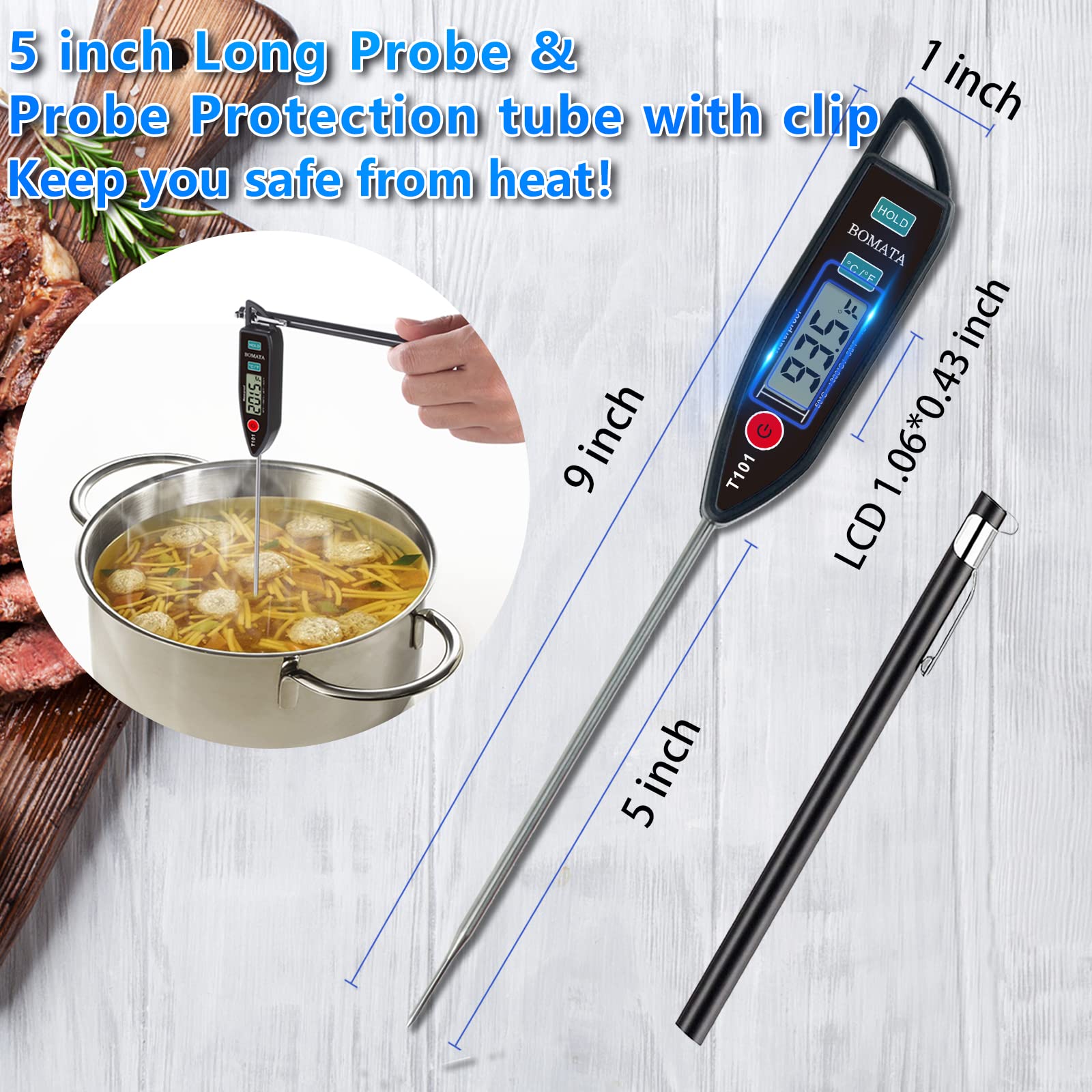 • [ Food-safe Long Probe, Good for Kitchen ] The 5 inch long probe is made of food-safe 304 stainless steel. This thermometer is easy to use, clean and fast reading, great gift for kitchen beginners and kitchen masters.