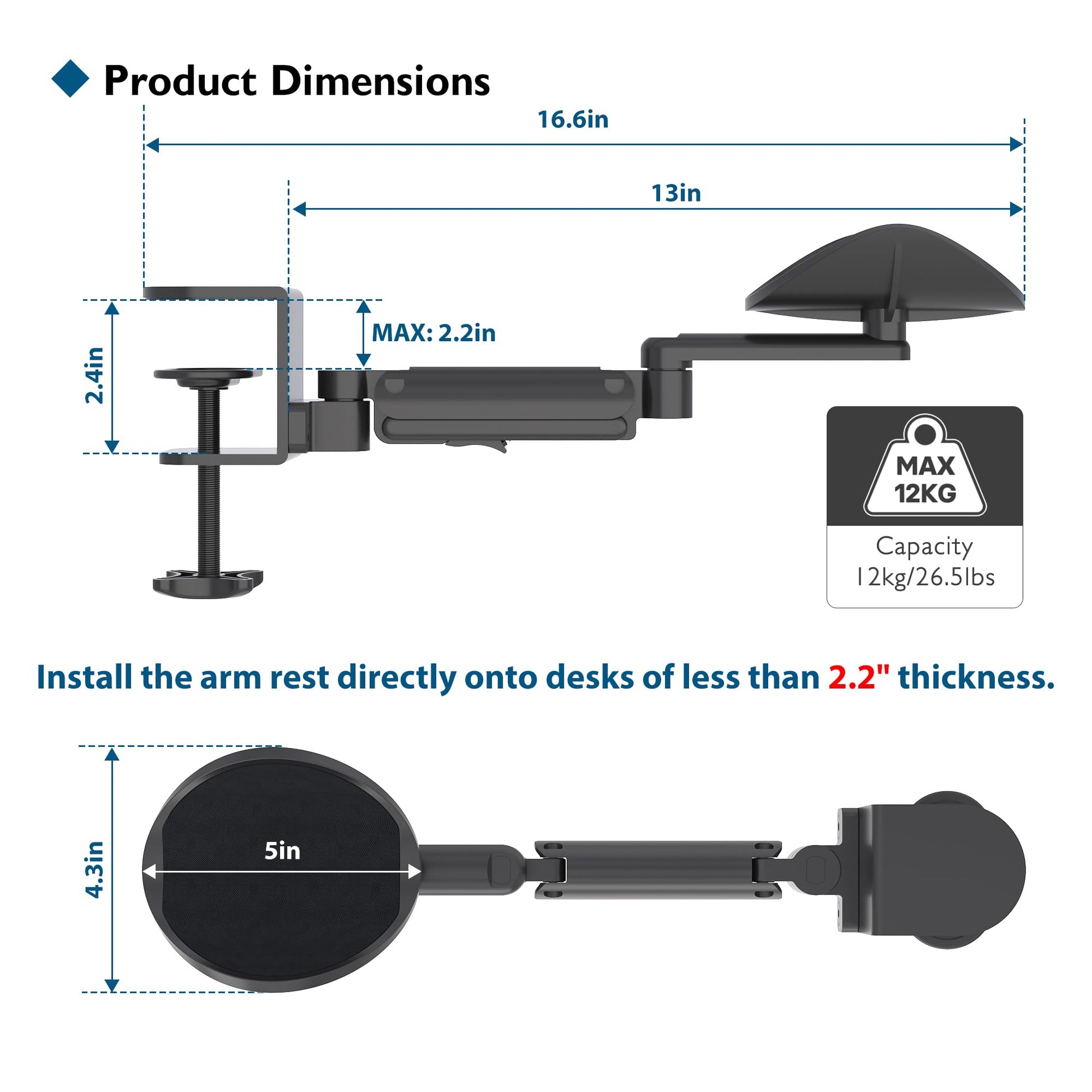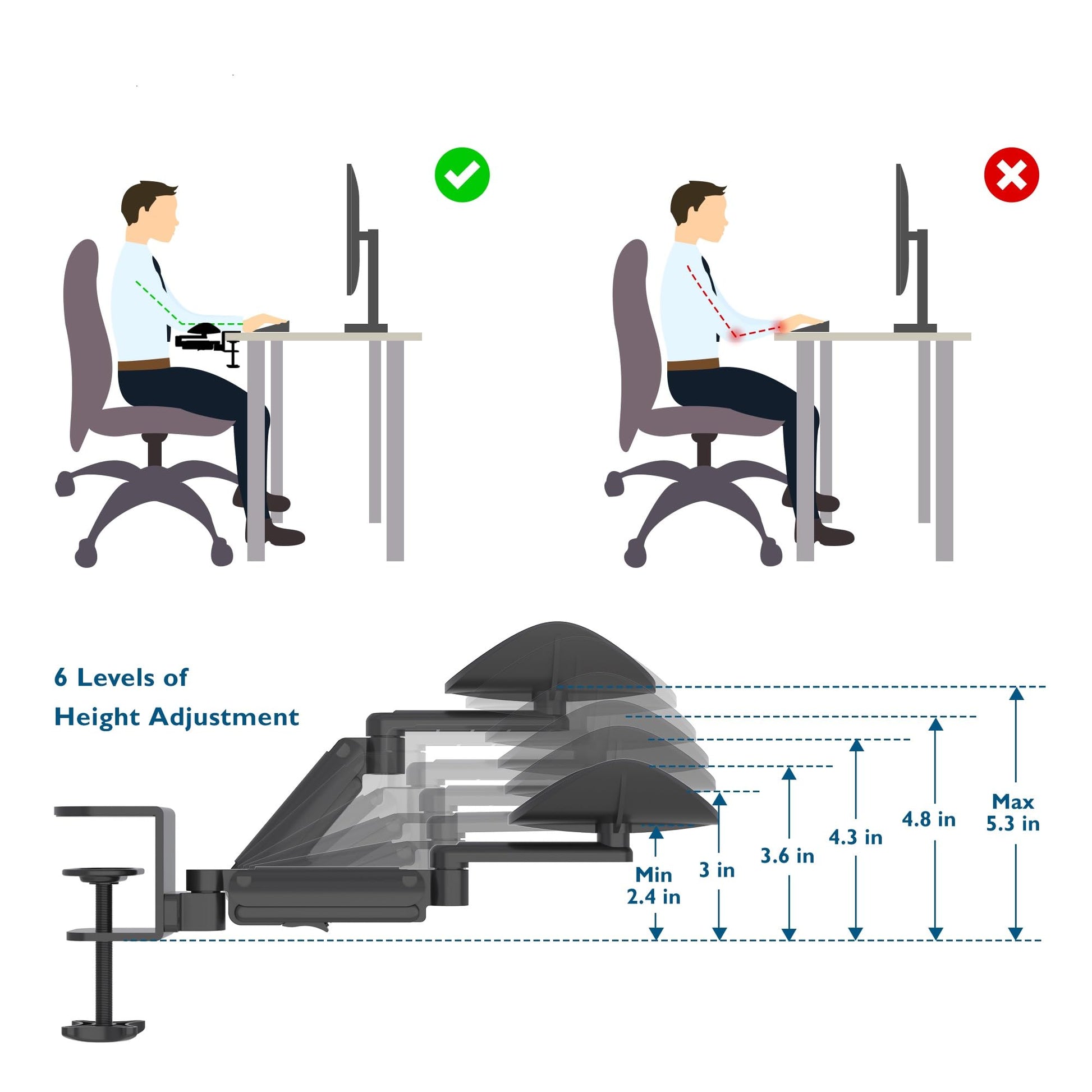 • FULLY ADJUSTABLE FOR PERSONALIZED COMFORT – This arm rest is fully flexible, rotating 360° and extending up to 13 inches to provide the most comfortable angle for you. Set it 2.8 inches higher than your desktop to improve ergonomic alignment and enhance comfort during both sitting and standing