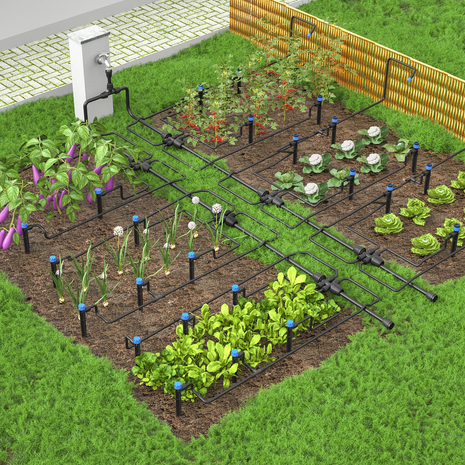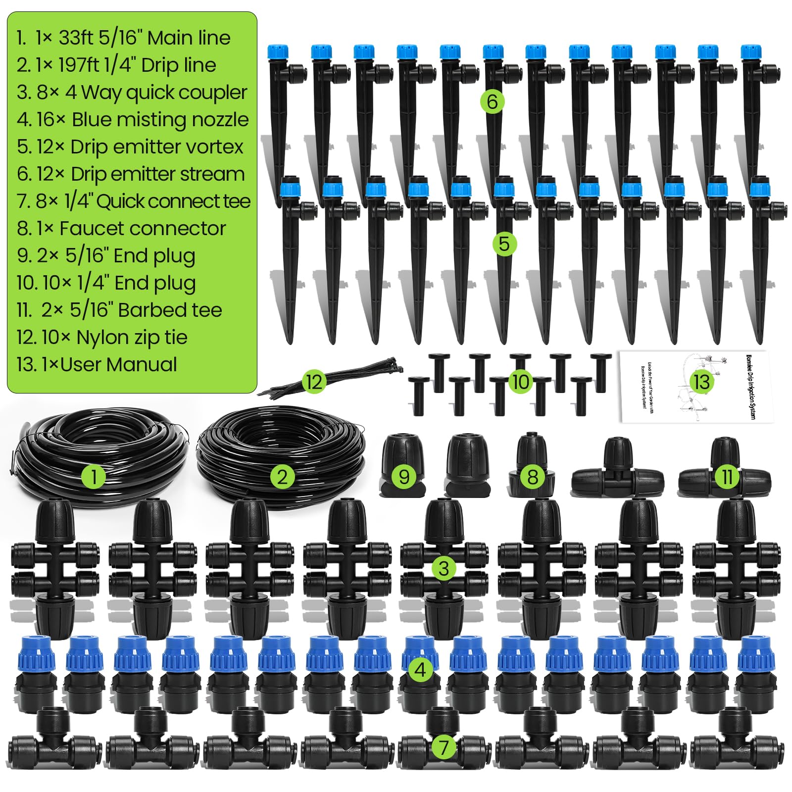 • 💧 230FT Complete Drip Irrigation Kit – Covers Your Entire Garden. This drip irrigation kit includes 230FT of high-quality tubing (1/4” & 5/16”), adjustable drip emitters, and everything you need for a customized garden drip irrigation system. Whether you have raised garden beds, flower pots, a greenhouse, or a lawn, this kit ensures your plants get the perfect amount of water.