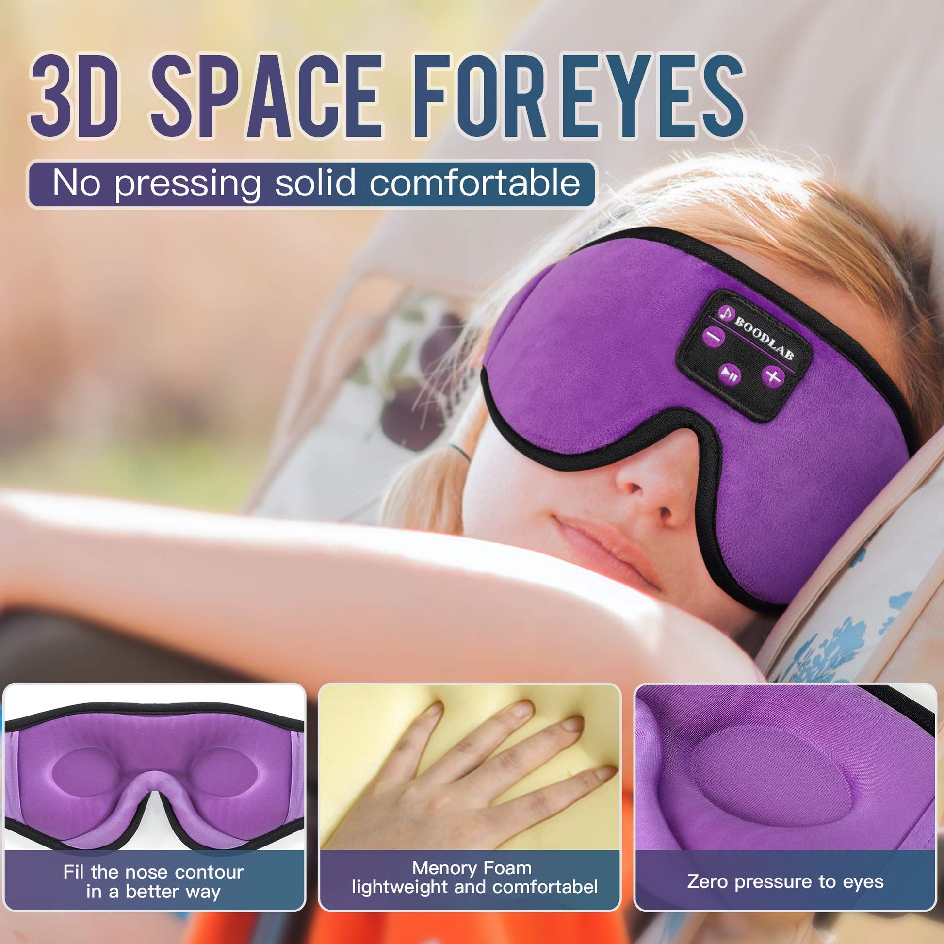 Boodlab Sleep Headphones Bluetooth Sleep Mask, 3D Sleep Eye Mask with Ultra-Thin HD Stereo Speakers Washable Adjustable for Sleeping Side Sleepers, Air Travel,Yoga,Meditation,Holiday (Purple)