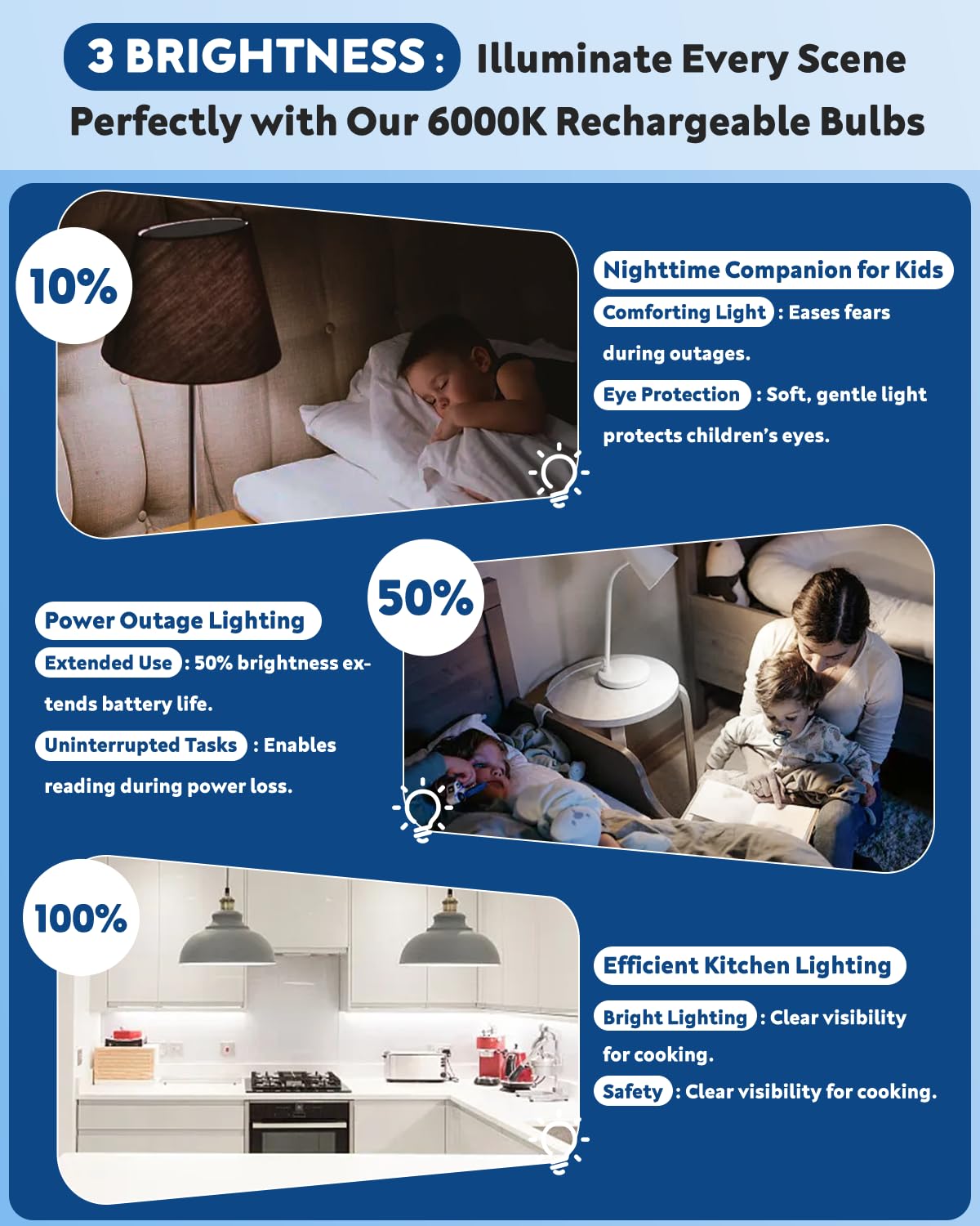 • 10%/50%/100% Adjustable Brightness for Versatile Use: These rechargeable light bulbs offer three brightness levels 10%, 50%, and 100%—providing up to 48 hours, 6-9 hours, or 2-5 hours of light. Perfect for nighttime care, reading, or fully illuminating dark spaces, it adjusts easily with your lamp or wall switch. BoRccdit Keeplit ensures extended battery life, ensuring every corner of your home stays bright and secure