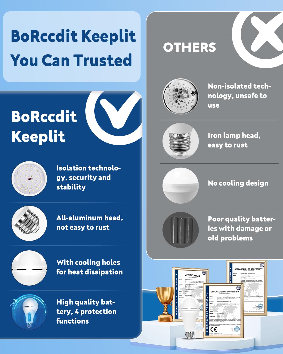 • 2025 Technology Breakthrough: BoRccdit Keeplit power outage light bulbs solves common issues like 'failure to switch on or off' with advanced technology, ensuring smooth operation even alongside regular bulbs. Whether at home or during an outage, you can count on consistent performance without sudden failures. Designed for ease of use, it’s safe and simple for everyone in the family—seniors and children alike can operate it with confidence