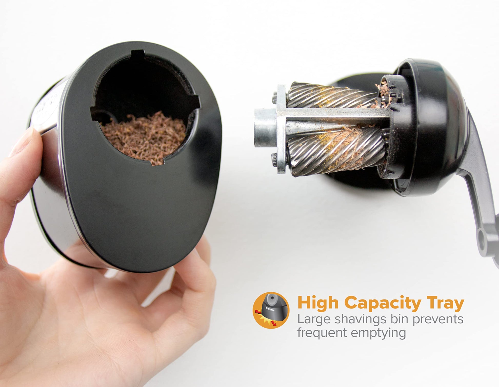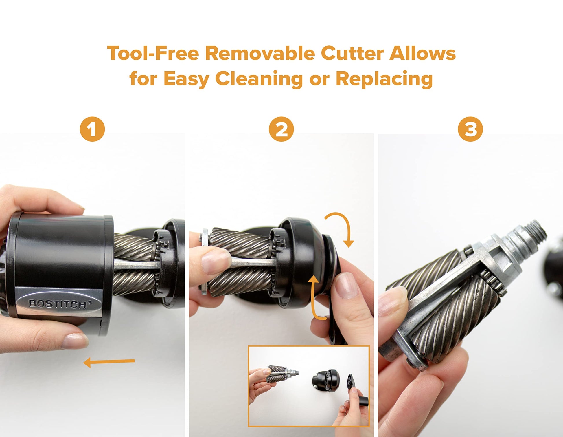 Details: This Bostitch manual pencil sharpener is a fresh take on a classic! Each unit features an oversized crank knob making it easy for kids to grip and use. What makes this sharpener really special is its replaceable cutter. If the cutter ever becomes dull, just swap it out! Don't throw out the whole unit. We're all about saving time and money. Plus, our HHC2 dual cutter technology extends the life of cutter by 6x*. Tip Saver Technology shapes the perfect pencil tip and prevents over sharpening. This manual pencil sharpener has high capacity shavings tray to hold a high volume of pencil shavings. Remove it easily for quick cleaning. The easy rotate selector dial fits 8 pencil sizes, making this mechanical pencil sharpener great for schools. With a durable all-metal construction and die cast base, this sharpener is built to last. The hand crank sharpener can be wall mounted using included screws or attached to a tabletop.