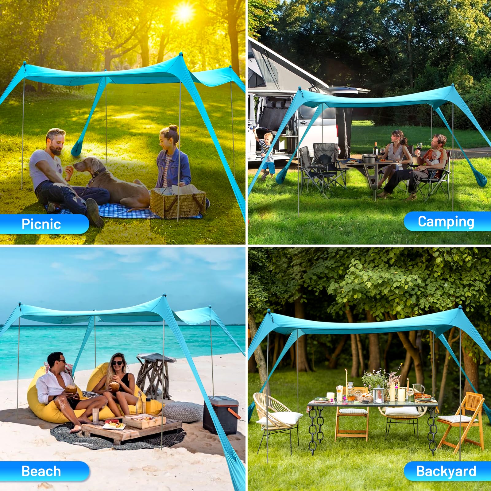 • 【Wonderful Choices Beach Tent Pop Up Shade】 You can also build compact beach sun shelter on gardens, backyards, lawns, sand, picnic, garden, group activities, field training, dummer camp,vehicle shading even rock campsites. Simply adjust sand anchors or the poles to change the angle of the shade to get the best sunshade