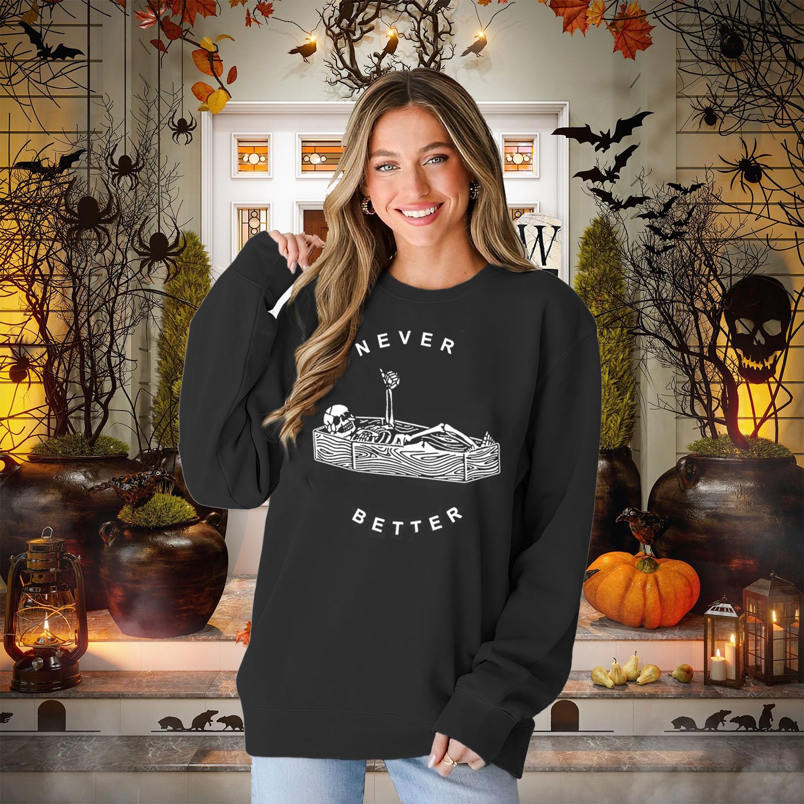 • 【Function】Halloween Sweatshirt for Women. Funny skull graphic skeleton sweatshirt can easily be worn with jeans, leggings, sports shirts, and shorts. This skull graphic pullover sweatshirt with designs of funny letter printing' never better' and 'coffin graphic', it's a fantastic shirt, you will get a kick out of it.