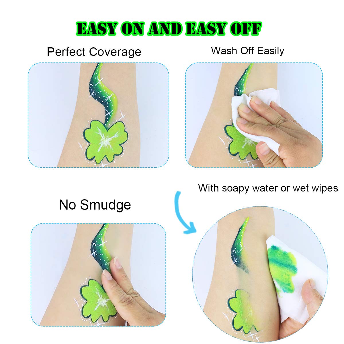• EASY TO USE AND WASH OFF:Our face paints are water activated and dries fast with extremely pigmented,provide long lasting,smooth and excellent coverage,less prone to fading or cracking.Different from cleaning wax-based or oil-based painting,you can easy wash off with soap and water or wet wipes.