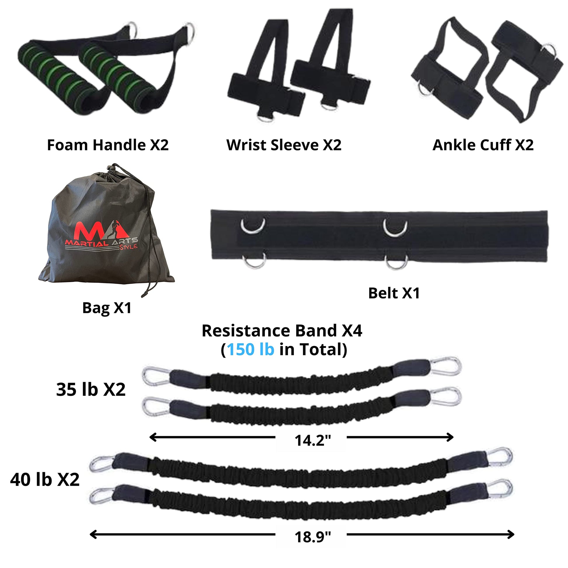 • WHAT YOU WILL GET - 2 foam handles, 2 wrist sleeves, 2 ankle cuffs, 1 adjustable belt, 1 carry bag, 2 resistance bands of 35 lb (14.17 inches) and 2 resistance bands of 40 lb (18.89 inches).