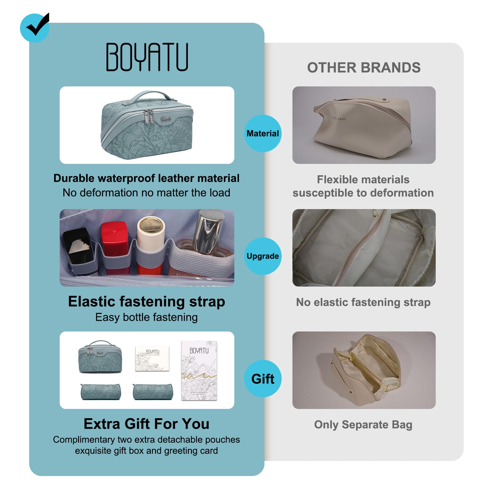 • Elegant Floral Makeup Organizer Bags: This women's cosmetic bag is made of high-quality PU leather, soft to the touch, waterproof and durable. Elegant appearance design will bring you countless awesome compliments. BOYATU portable travel cosmetic bag is a great choice and ideal companion for you.