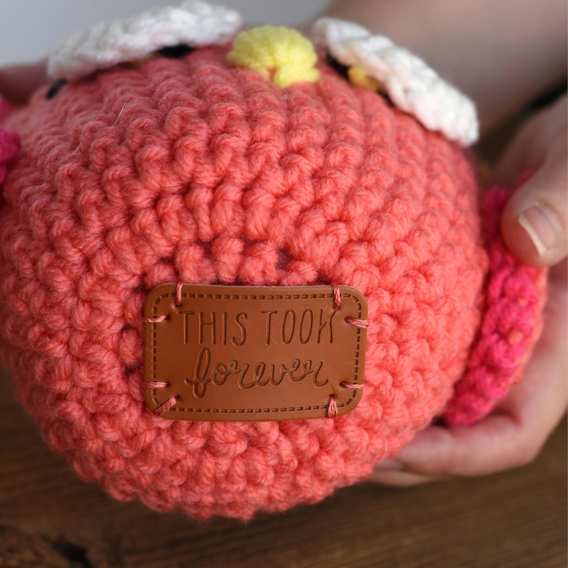 • Sew on tags read ''This took forever'', ''You better use this'', and ''one of a kind''.