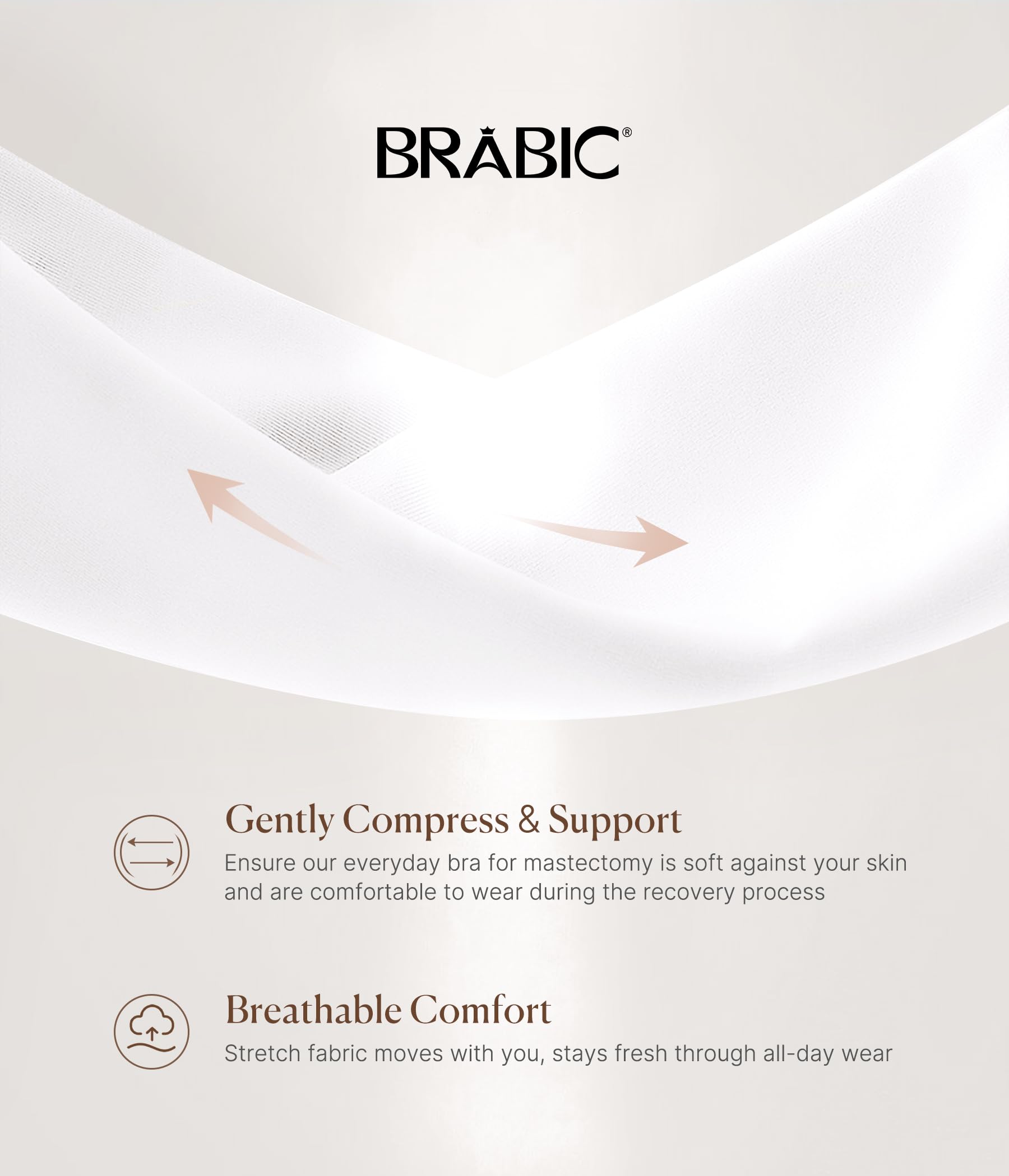 • COMFORTABLE POST-SURGICAL FABRIC. This post surgery compression bra is made from 84%cotton+16%spandex, won’t irritating your skin and incisions. Double-layered fabric cups gently compress and support the bust in unique compression fabric, which ensure our brabic everyday bra for mastectomy is soft against your skin and are comfortable to wear during the recovery process. Flat seams and fine stitching can eliminate indentations on your skin, and prevent markings on outer clothing.