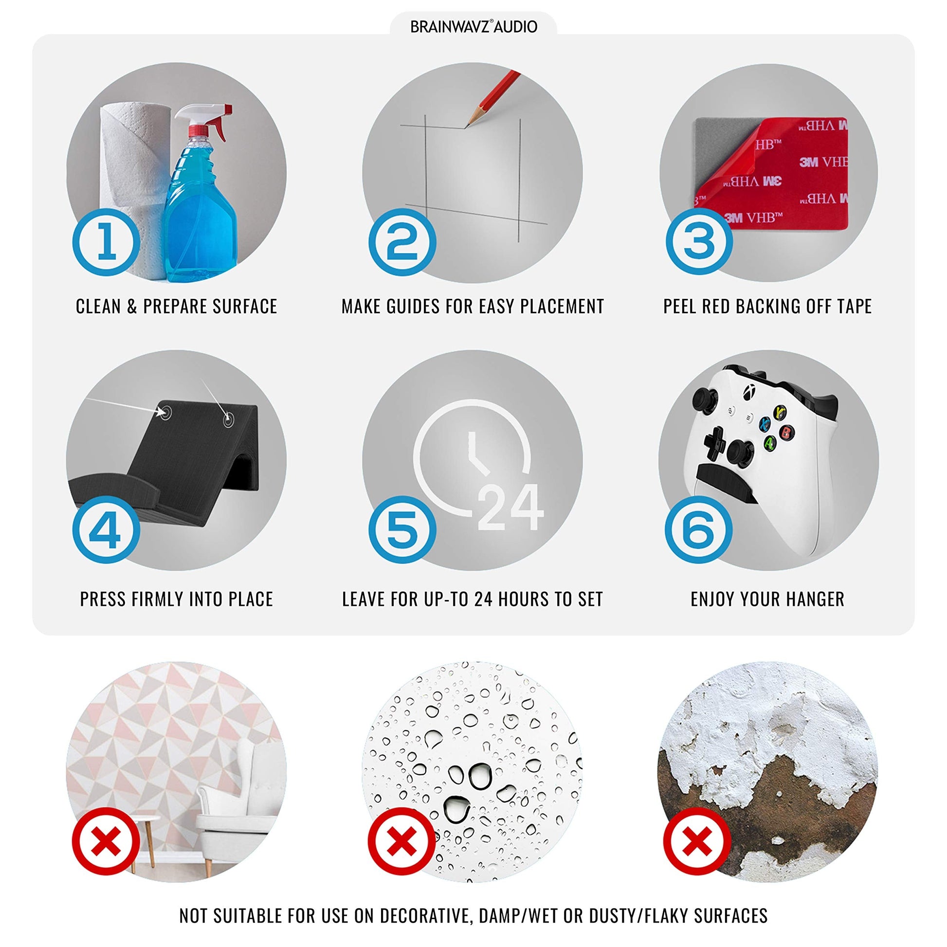 BRAINWAVZ Game Controller Holder Wall Mount Stand (2 Pack) For XBOX, PS5, SERIES X, ONE, PS4, PS3, SWITCH, NINTENDO, PC & MORE, Fits Latest & Retro Gamepads, Stick On, Easy To Install, UGC1