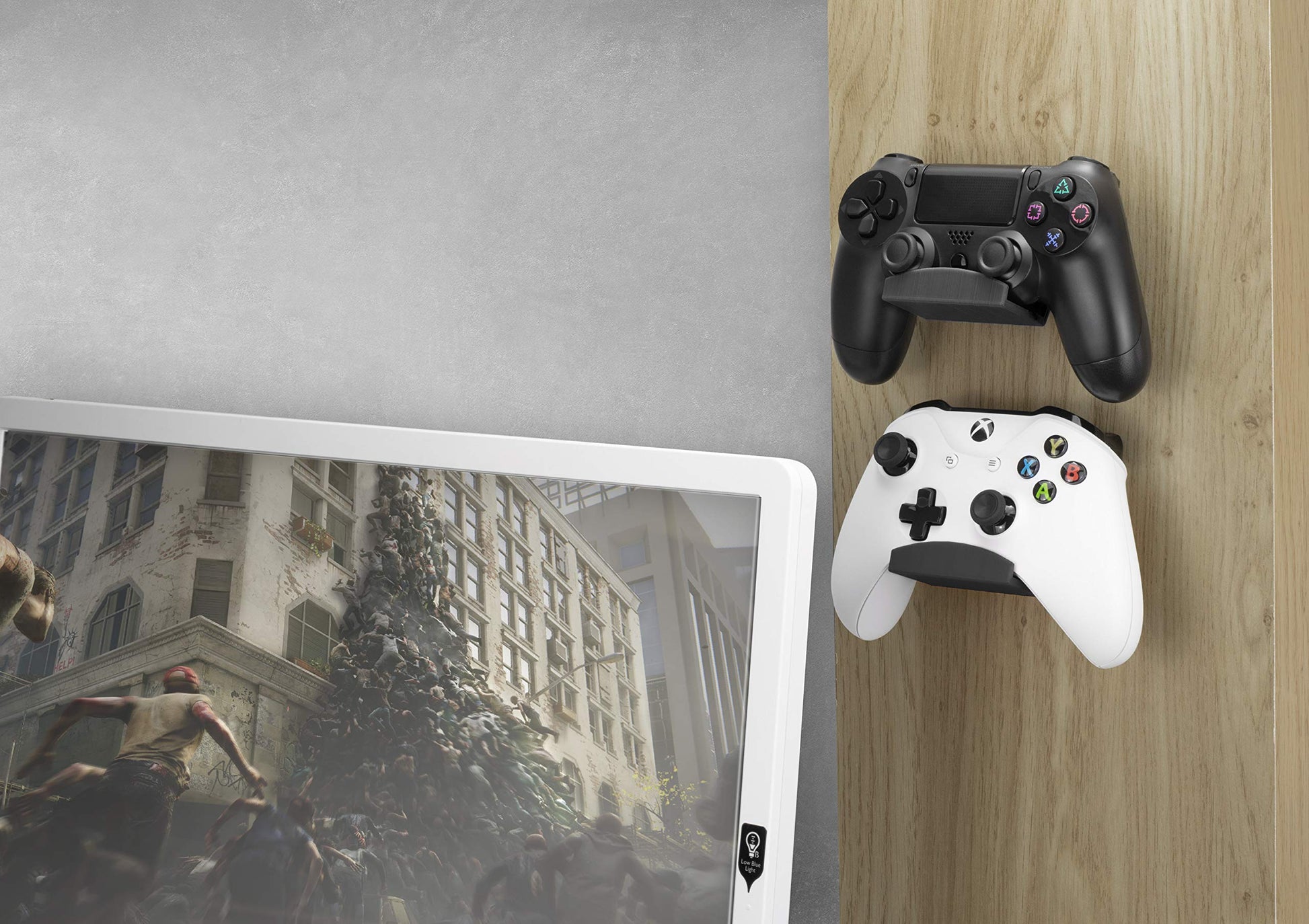 • UNIVERSAL GAME CONTROLLER HOLDER WALL MOUNT: Works with Xbox One, 360, Playstation PS4, PS3, Nintendo Switch, Steam Controller, Desktop PC Gamepads and most other third party made game controllers.